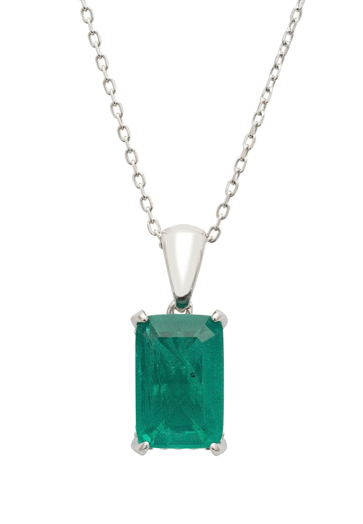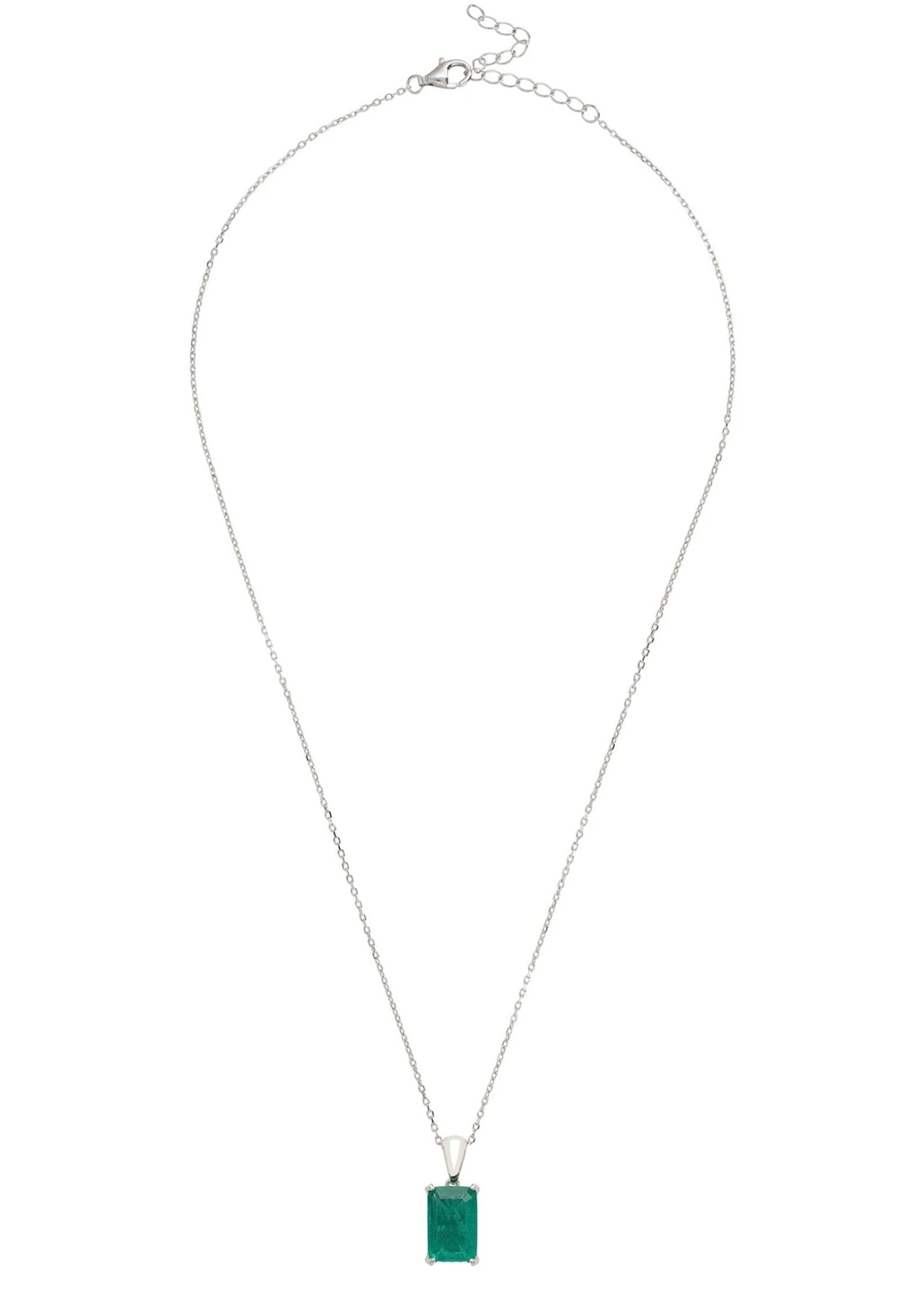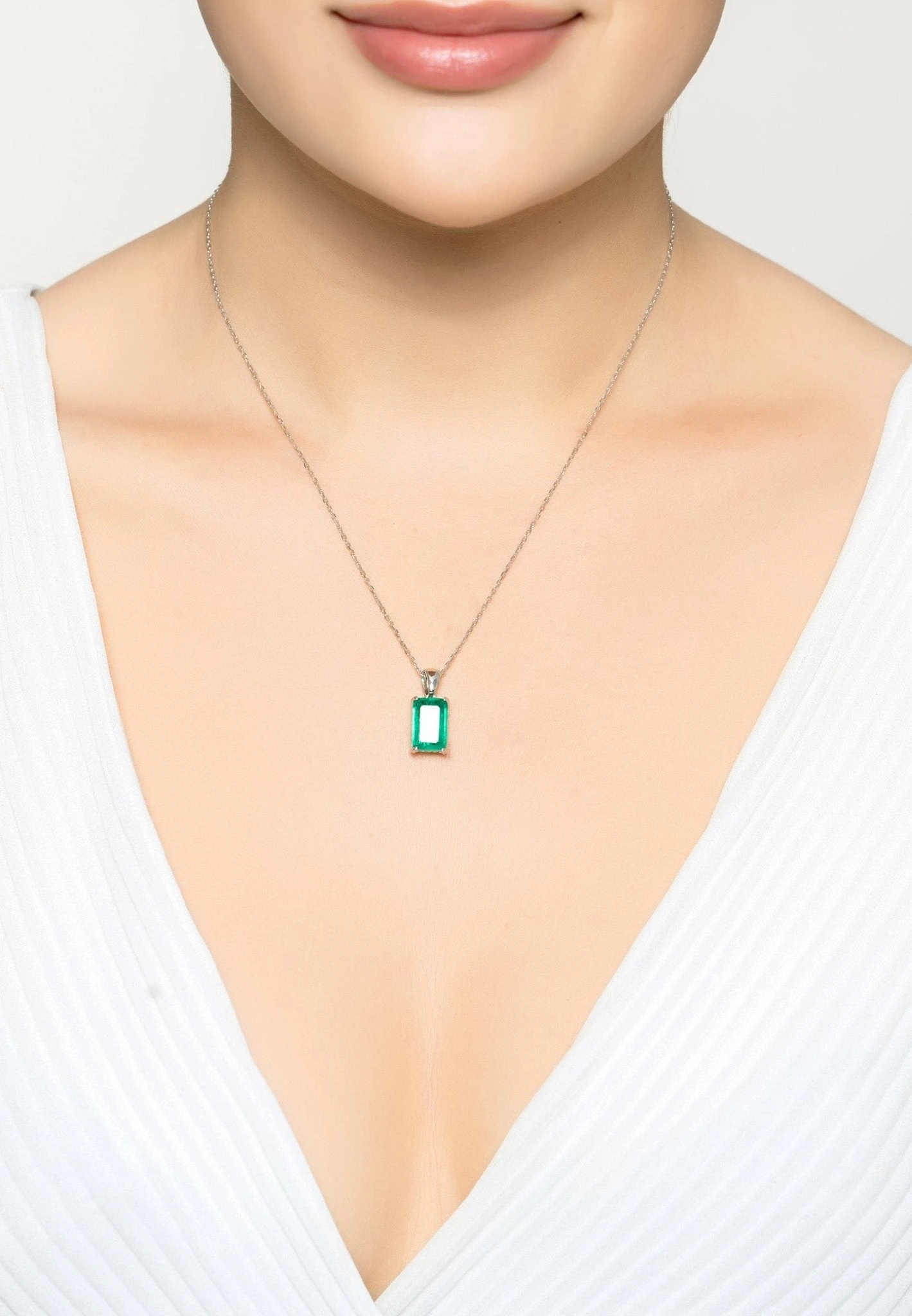 Introducing the Alexandra Rectangle Gemstone Necklace Silver Colombian Emerald! This necklace is the perfect piece for a timeless statement. Handcrafted with 925 sterling silver, it features a rectangular shaped lab-grown Emerald with sparkling simulated diamonds adorning the sides and back in an open design setting measuring 1.2cm x 0.8cm.