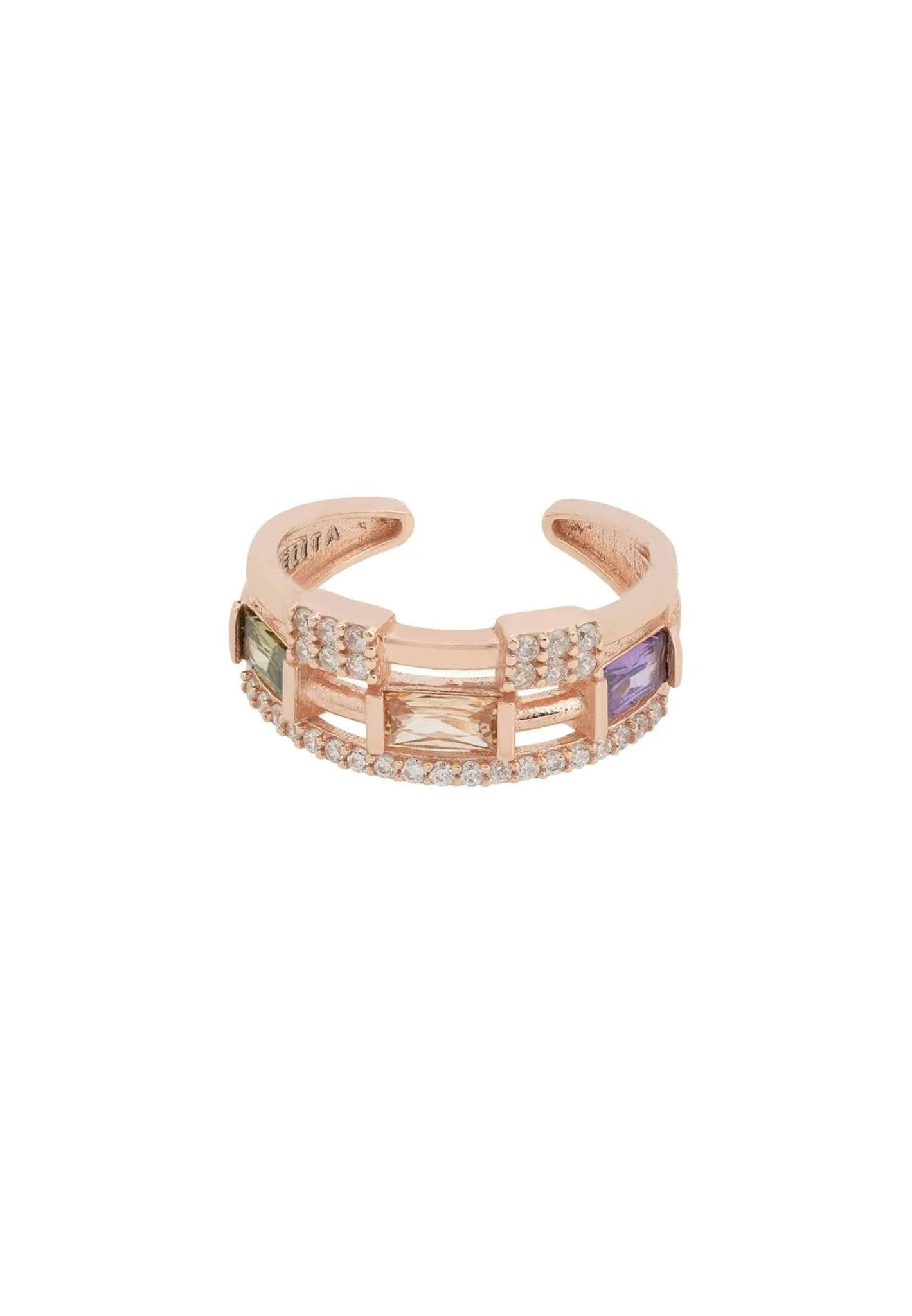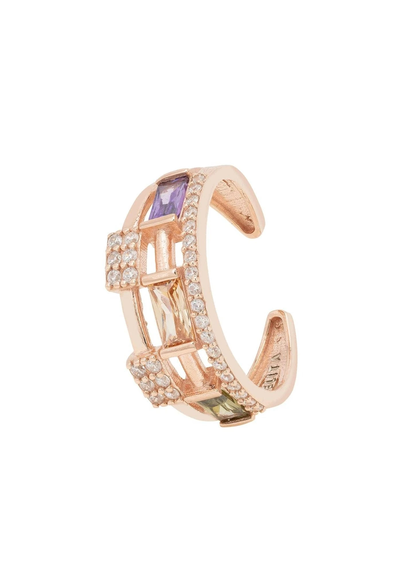 925 sterling silver dipped in 22ct rosegold. Square baguette cut Smokey Quartz, Peridot Quartz and Amethyst gemstones. Handset cubic zirconia.