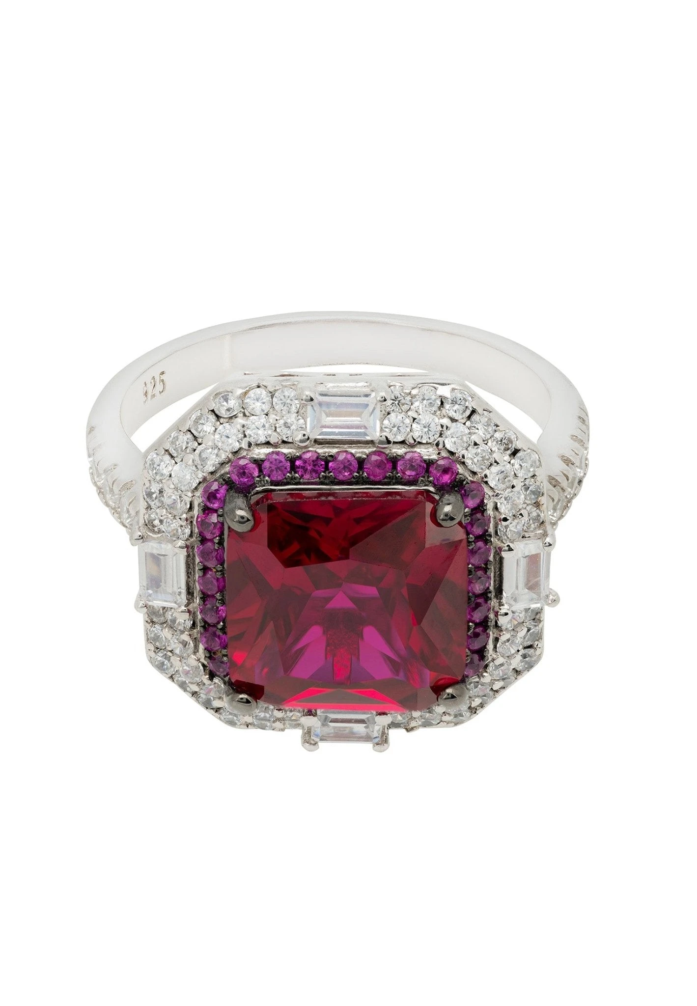 Introducing the Anastasia Gemstone Cocktail Ring. This stunning piece features a square shaped ruby centre stone framed by red cubic zirconia, with a double row of sparkling simulated diamonds around the outer edge for extra bling!