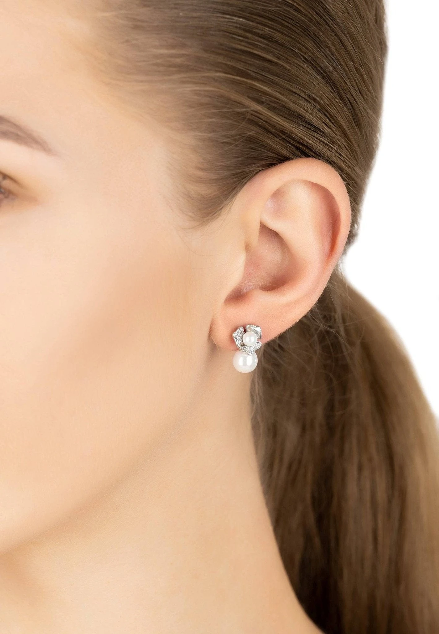 These pretty earrings feature an open flower with curved petals to create a three dimensional appearance. The flower consists of three petals, two are adorned with sparkling cubic zirconia with the third left plain, a small pearl resides at the centre of the flower and a second, larger pearl, is fixed beneath the flower.