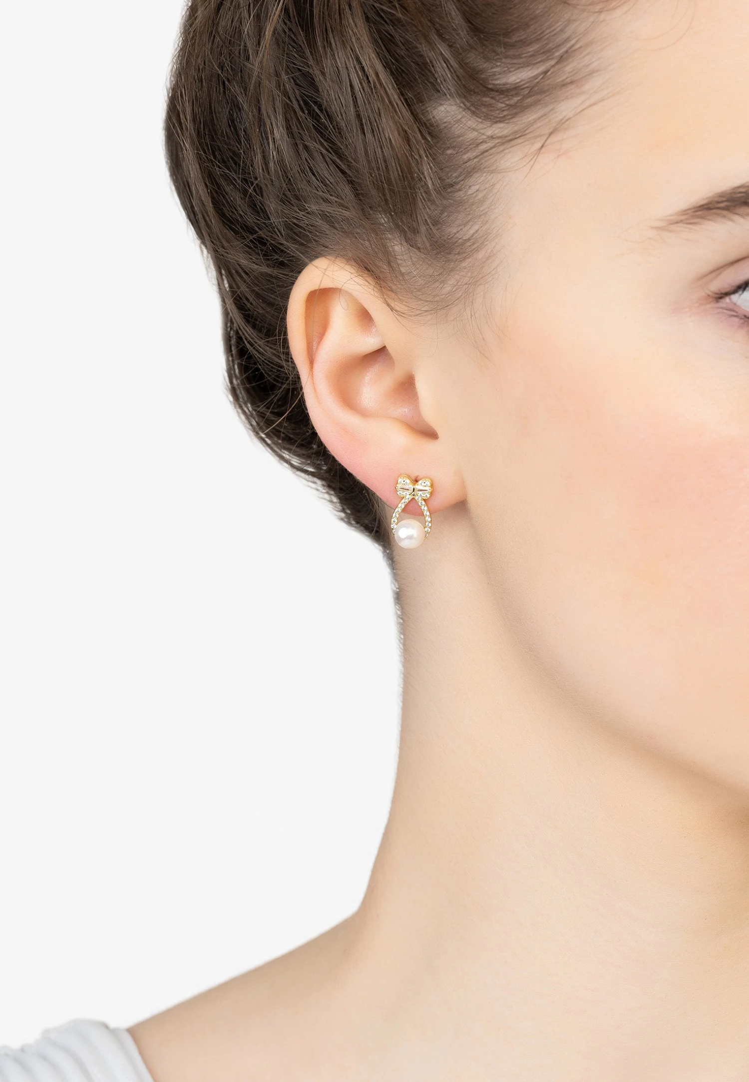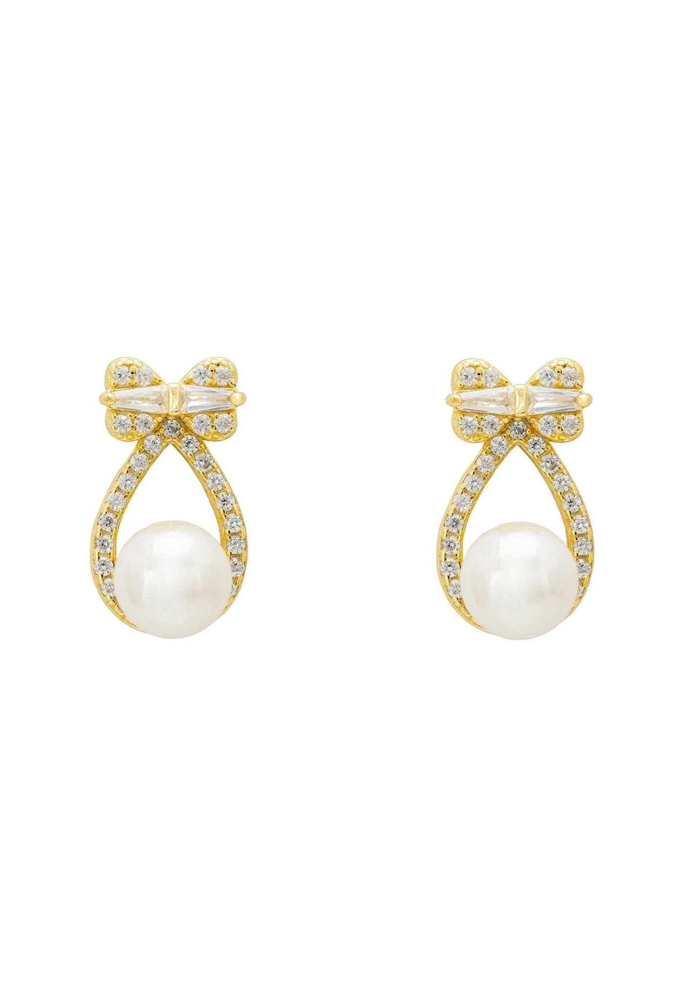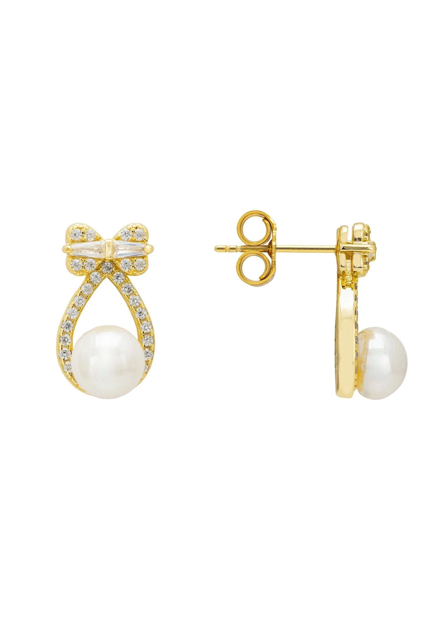 Get ready to turn heads with our Bows And Pearls Earrings in Gold. Made from top-notch 925 silver and dipped in lush 18-carat gold, these earrings are all about delicate beauty. Shaped like a cute tied ribbon, each earring has a bow up top and a loop at the bottom. Nestled in that loop? A gorgeous round pearl that just oozes class.