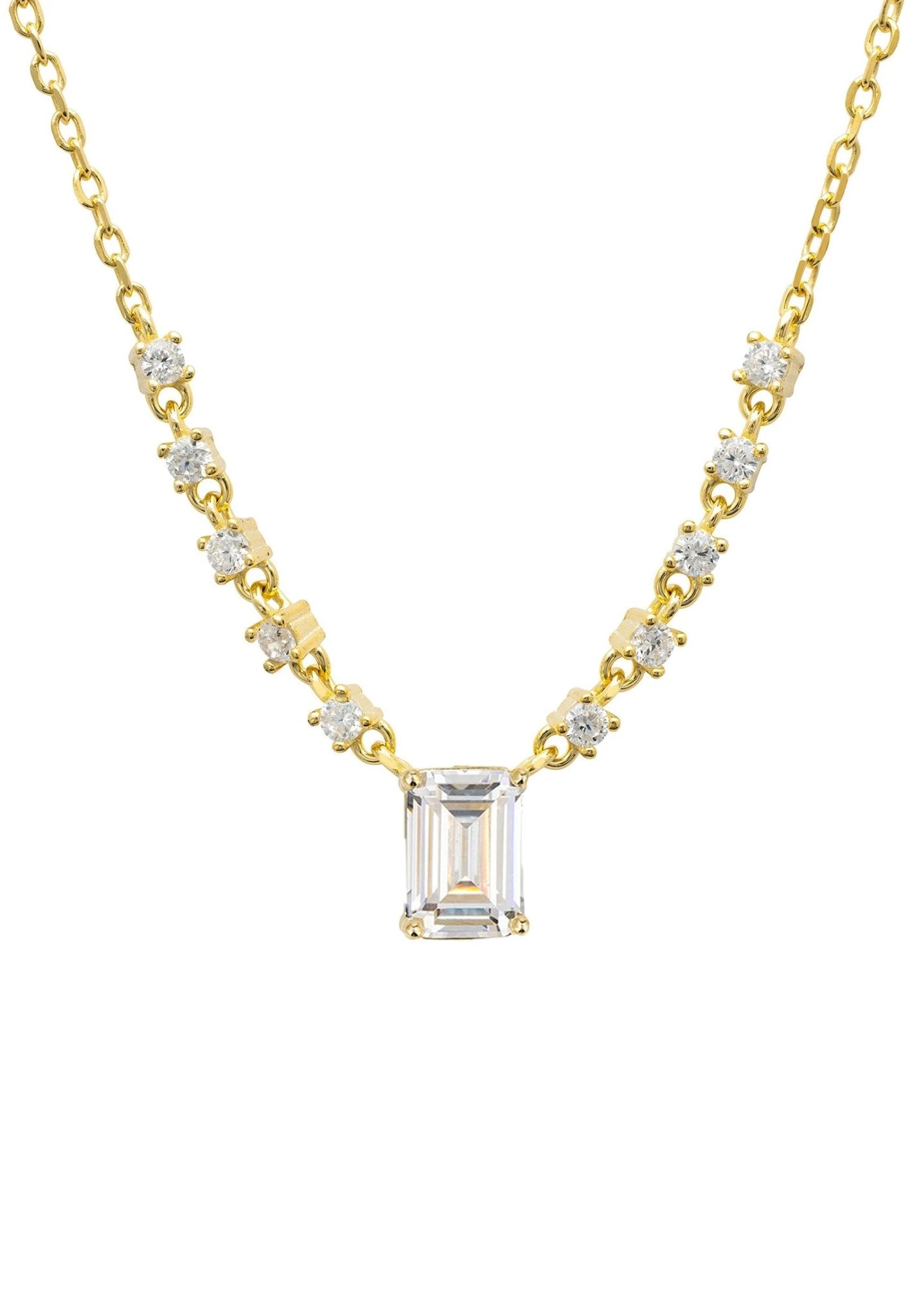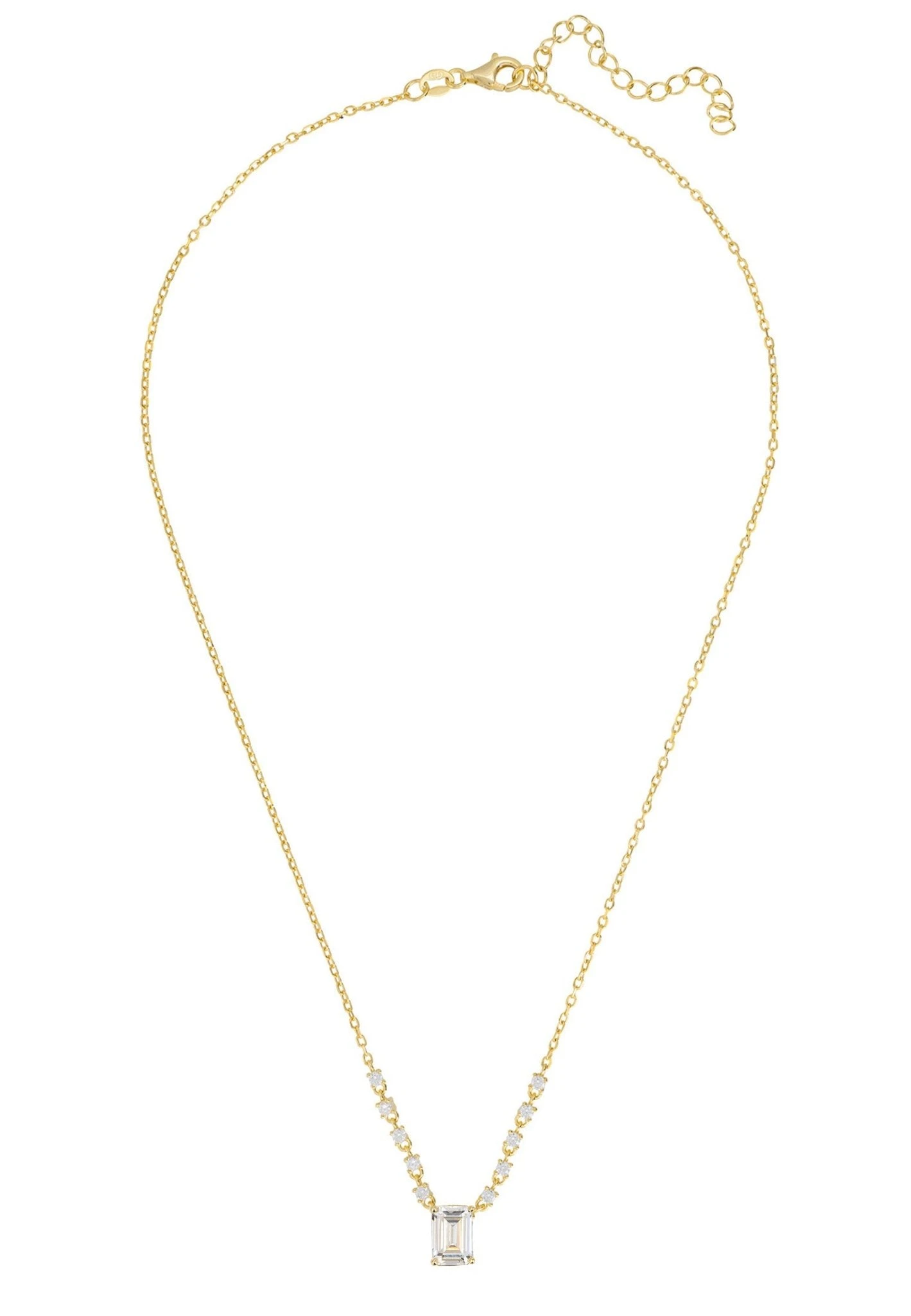 Introducing our Claudia Gemstone Pendant Necklace Gold, the perfect accessory for any stylish outfit. This stunning pendant necklace features a shimmering and eye-catching gemstone centre stage. Handcrafted with quality 925 sterling silver and beautifully plated with 18ct gold, this necklace is designed to look elegant but also show off some fashion-forward style. The small gemstone measures 0.7cm by 0.5cm and is set off perfectly by cubic zirconia running along the front aspect of the chain of this necklace, adding a timeless sparkle that will have heads turning in admiration.