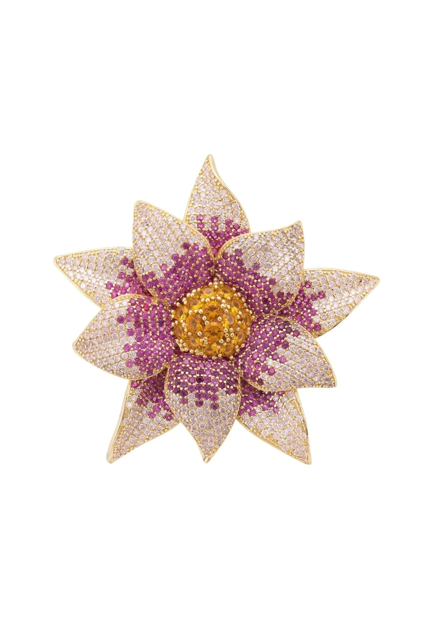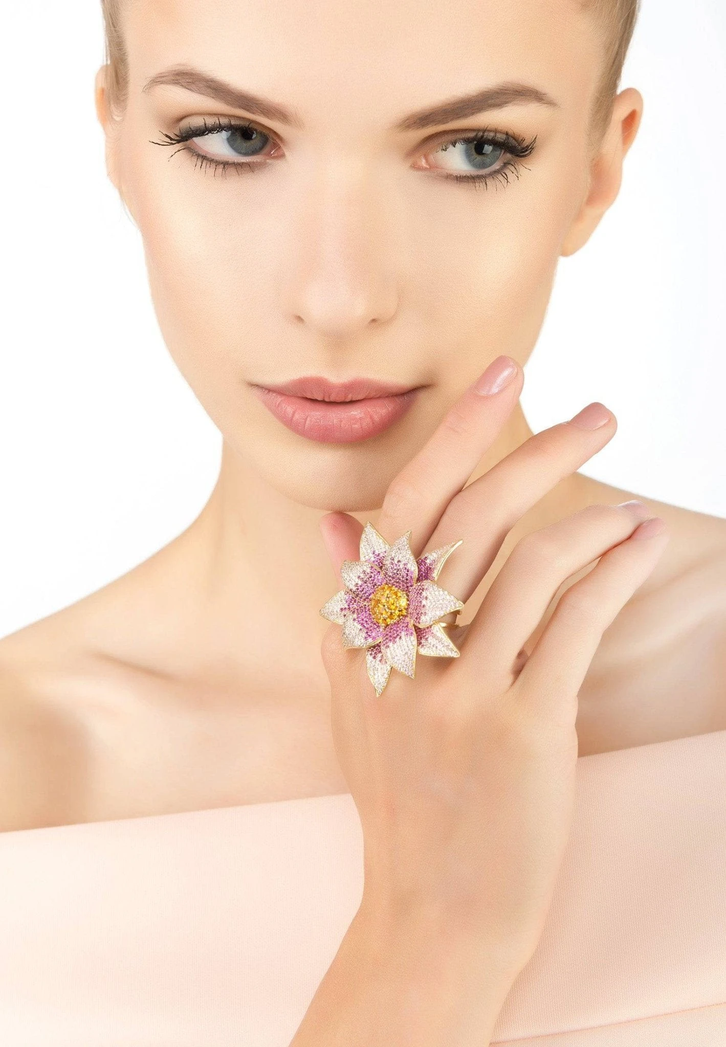 This large daisy ring is adorned on each petal with sparkling cubic zirconia in graduated shades of pink. Vibrant yellow zircons sit at its centre. Made in a three dimensional design for added interest, which will add a touch of sophisticated style to any outfit.Â