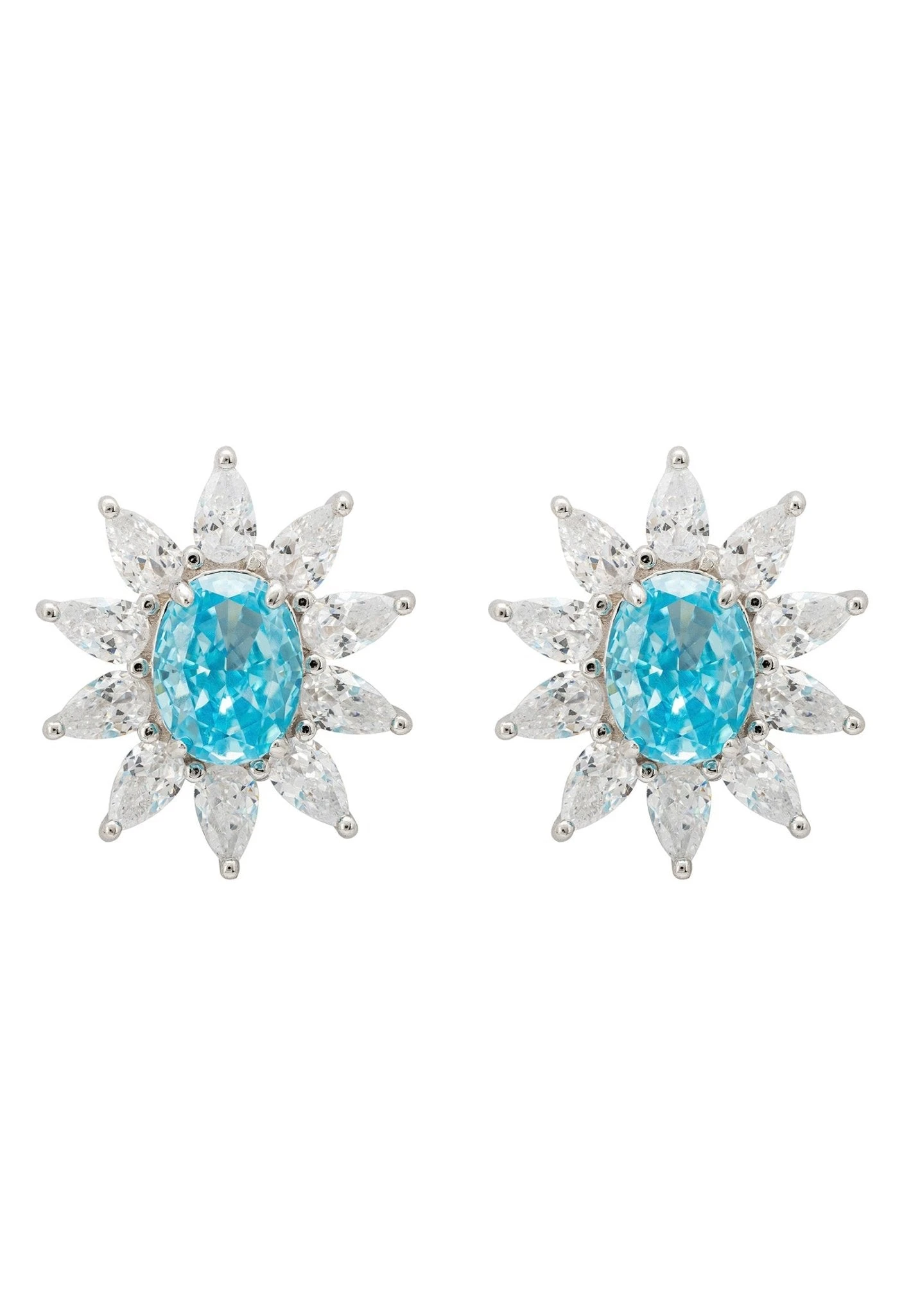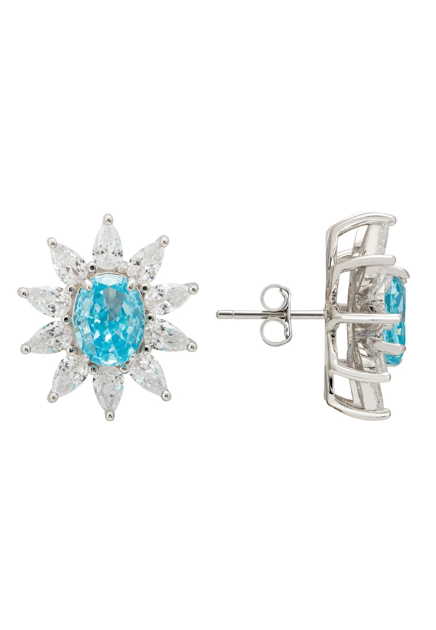 Framing this stunning gem are sparkling teardrop-cut cubic zirconia petals, arranged to shimmer and shine from every angle. With a comfy fit at 2.2 cm in length, 1.8 cm in width, and weighing only 9.0 grams, these earrings are as easy to wear as they are beautiful.
