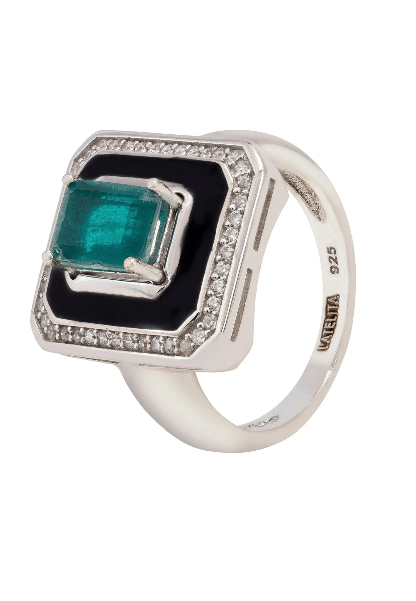 With its geometric shapes and bold colours, this ring makes a true statement of elegance and style. The central emerald is set off beautifully by the black enamel background, and is surrounded by dazzling white cubic zirconia.