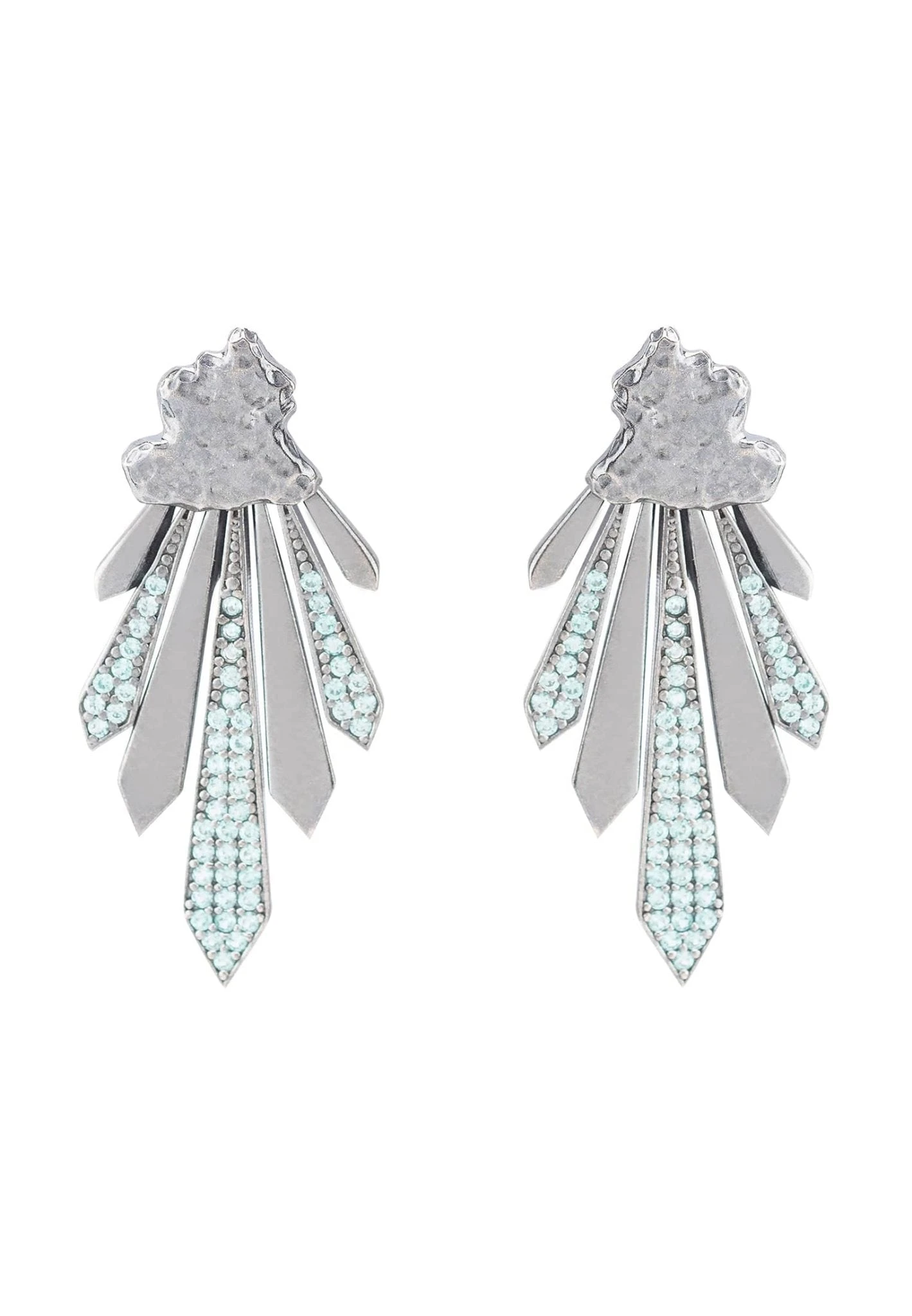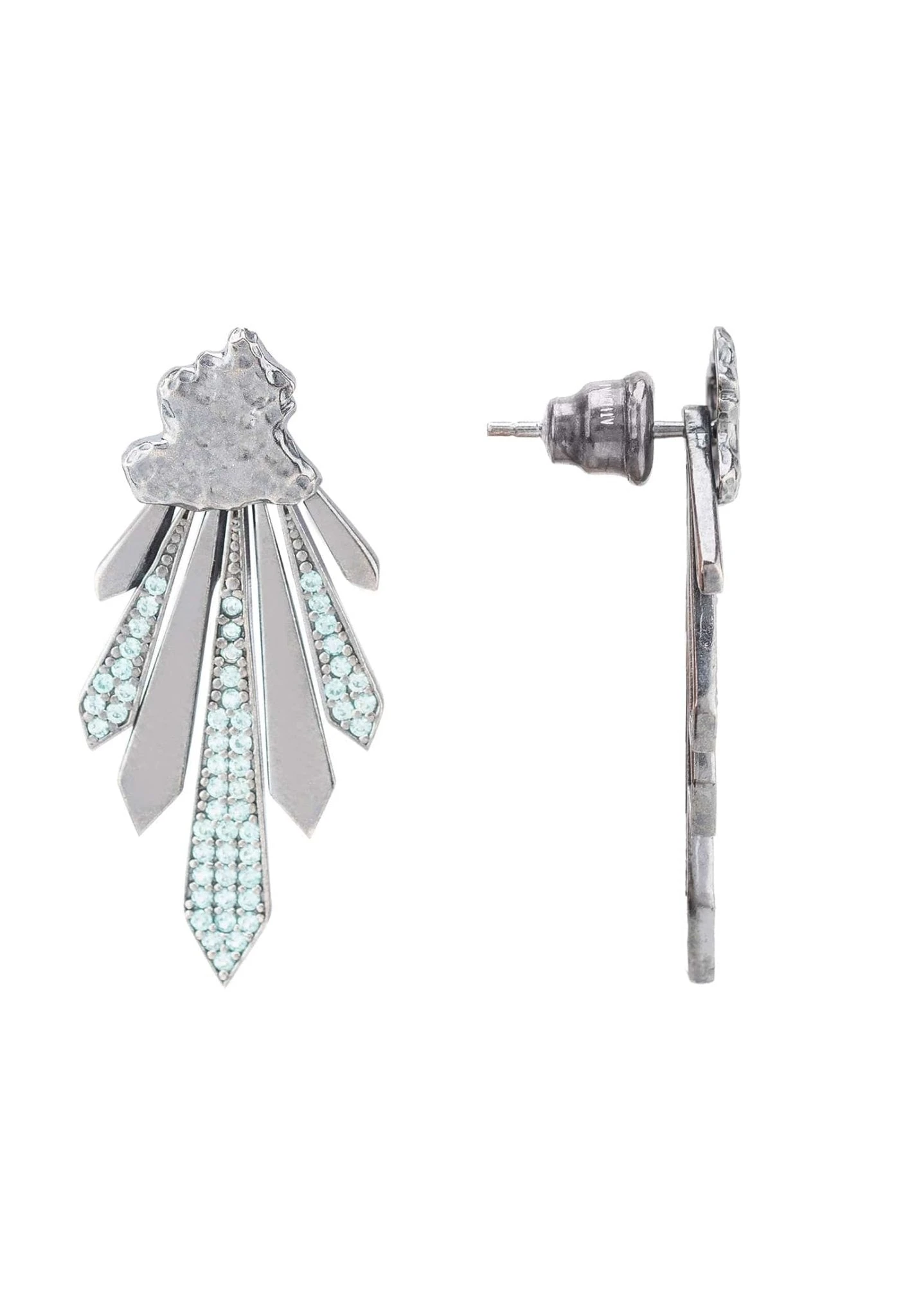 The versatility of this stunning earring allows for it to be worn two ways. Wear in its full glory with zircons adorning the art deco design fan jacket, that sparkle as they catch the light with their natural movement, or as a simple but beautiful organic shaped metallic stud.
