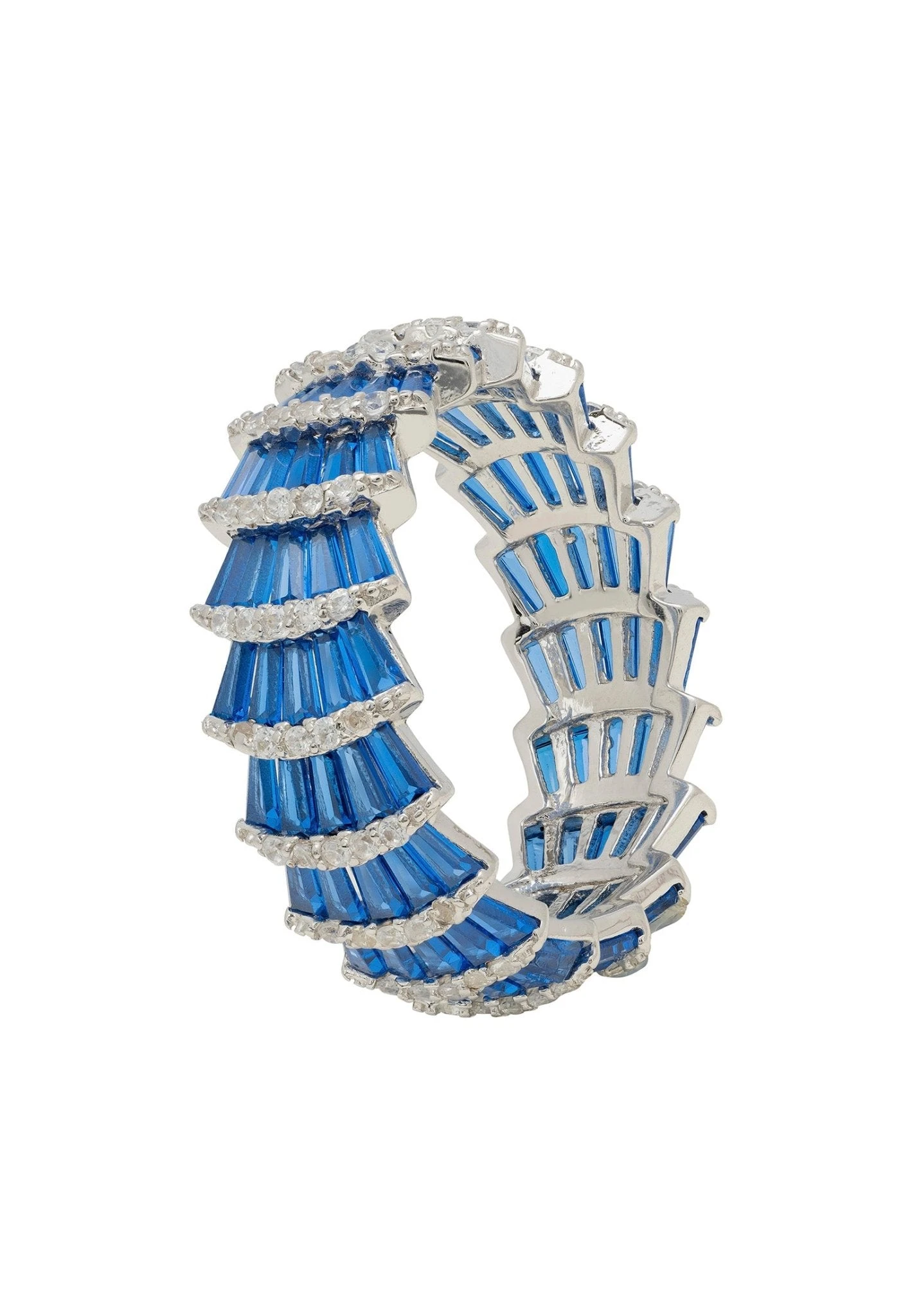 Give your look a touch of finesse and sparkle with the Deco Fantail Cocktail Ring Silver. Crafted with 925 sterling silver in a wide band design, this ring is the perfect accessory for any event. Completely adorned with sapphire blue baguette cut zirconia and pave white zirconia around the entire band in a striped pattern, this beautiful piece will help you shine no matter the occasion.