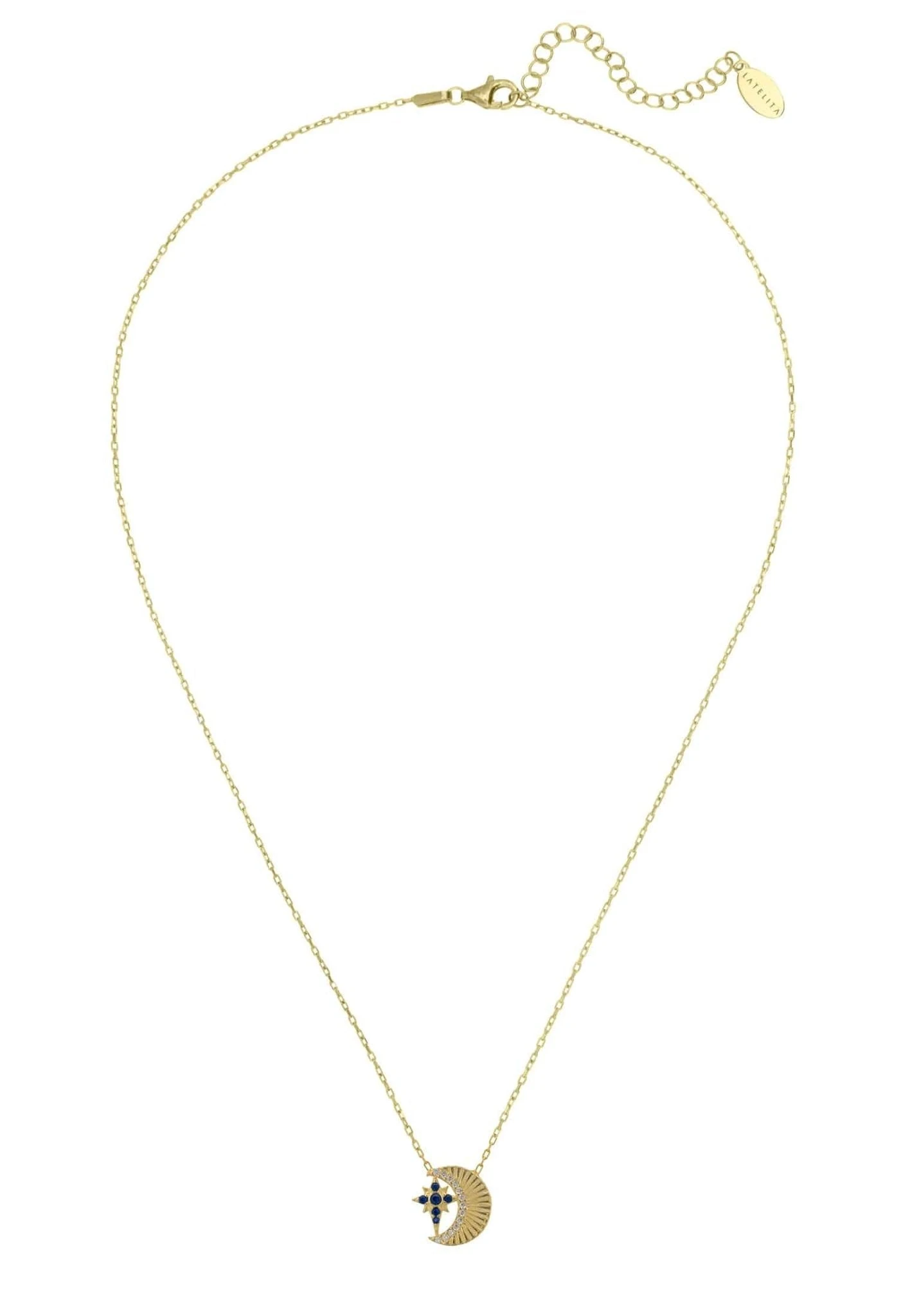 This pretty necklace features a crescent moon adorned along its inner edge with sparkling white zirconia with a star that sits snugly within the arc of the moon embellished with blue zircons.