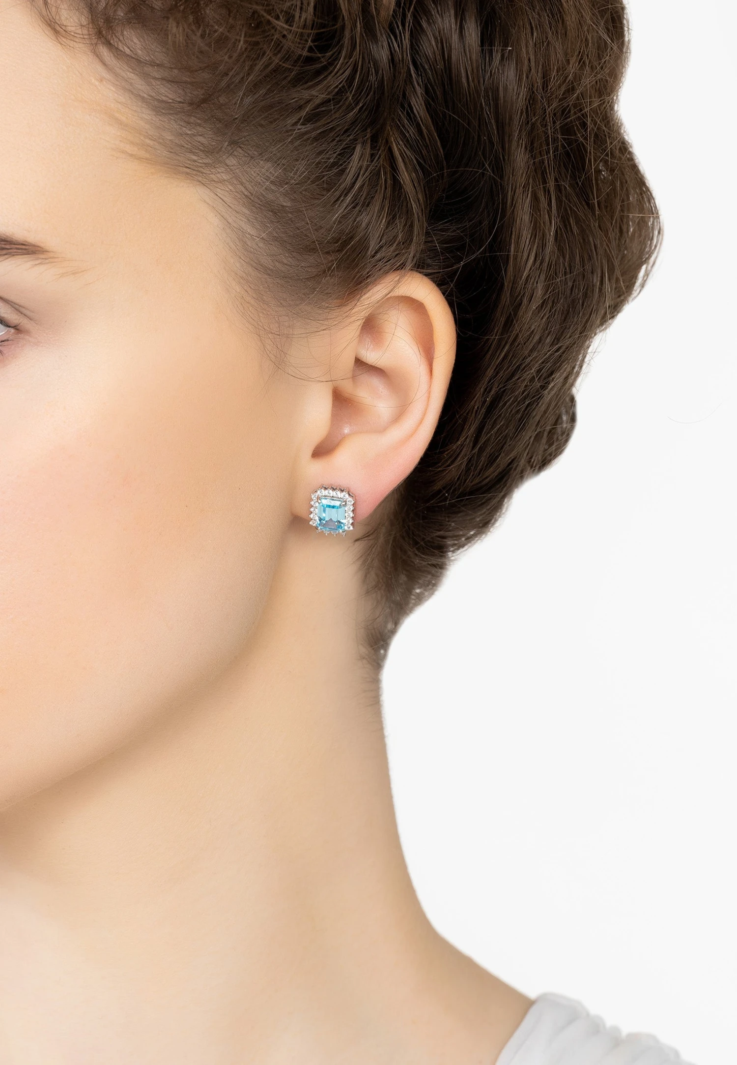Meet the Elena Gemstone Stud Earrings Blue Topaz Silver. Each earring measures a comfortable 1.2 cm in length and 1.0 cm in width, and weighs an easy 3.5 grams, making them perfect for all-day wear. At the heart of each stud is a lab-created Blue Topaz, a gem known for its dazzling blue hues and qualities of calming and balance. Each rectangular Blue Topaz is skilfully framed by cubic zirconia, adding an extra layer of sparkle that elevates the gemstone’s natural beauty.