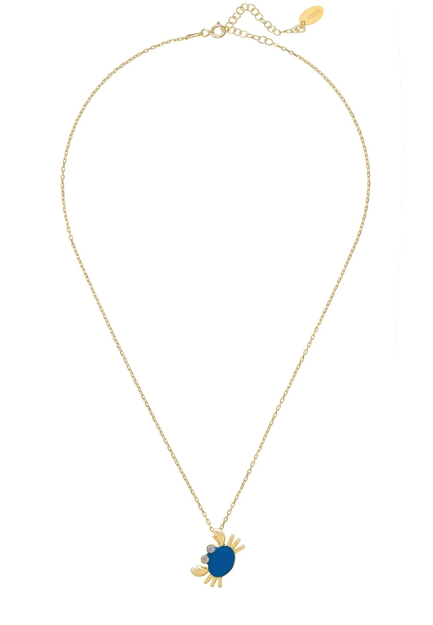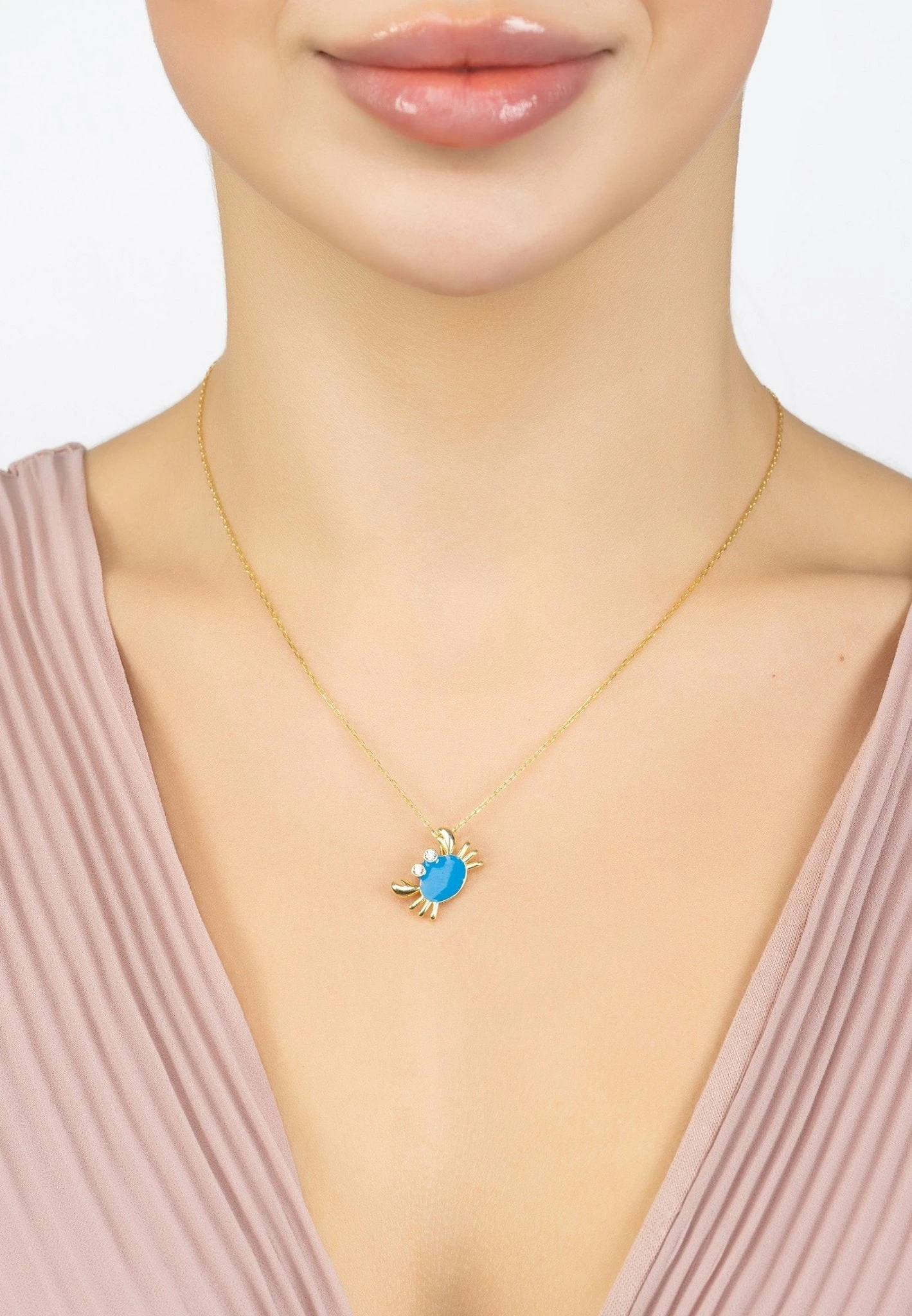 This fun and colourful Feeling Crabby Turquoise Enamel Necklace Gold is the perfect way to brighten up your day and your outfit. Handcrafted from 925 sterling silver and dipped in 22ct gold, this necklace features a crab motif pendant with highly polished metallic legs and claws, an oval body set with turquoise enamel, and two zircons for the eyes.