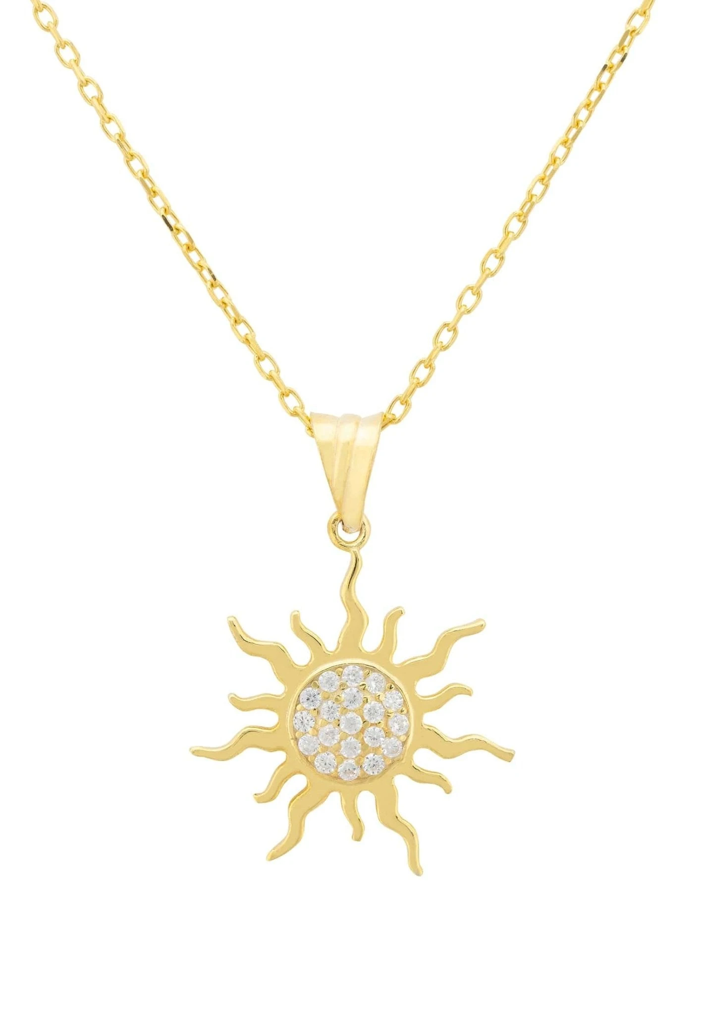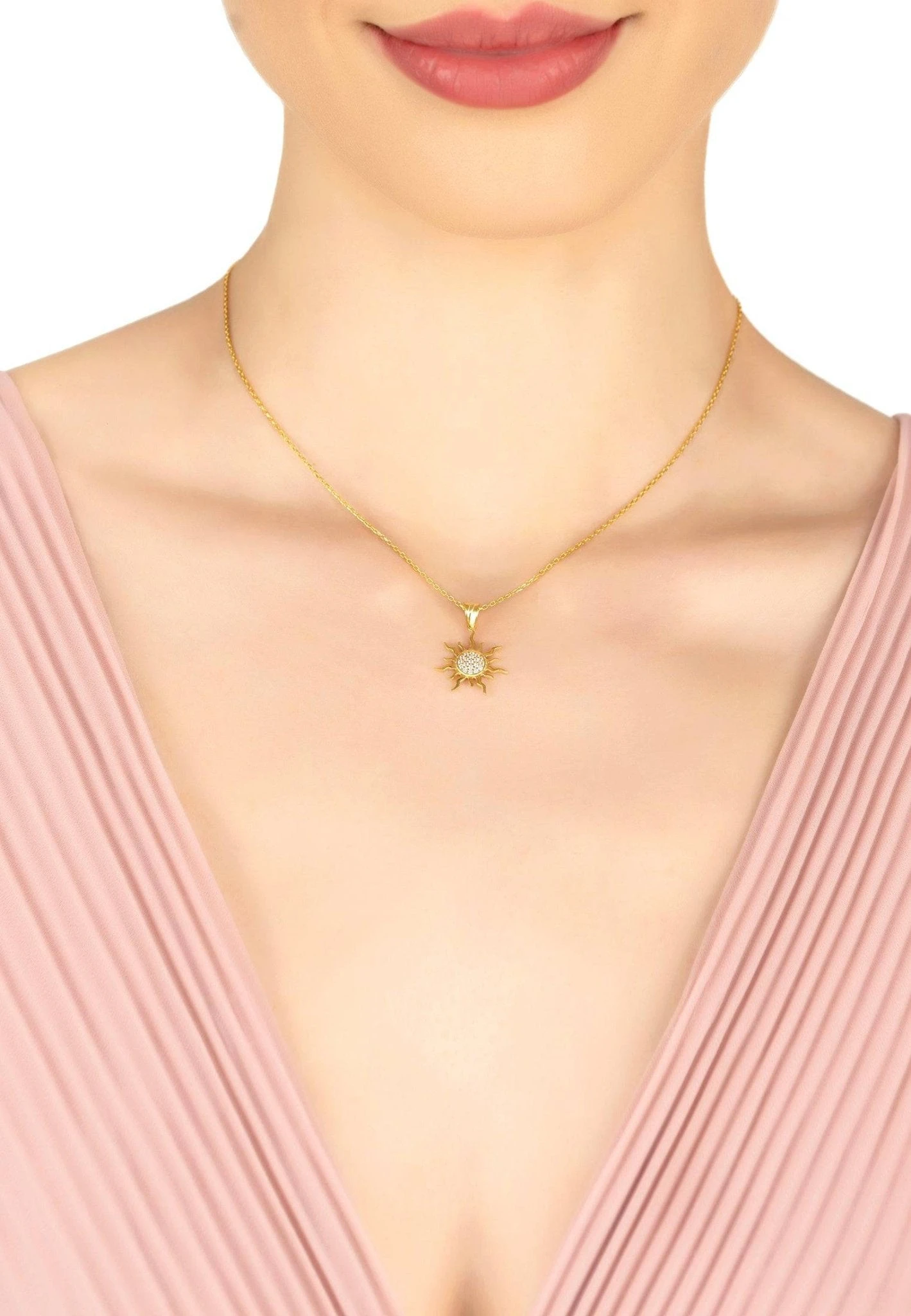 The pretty sun motif is decorated with white zirconia at its centre, the suns rays are left to a highly polished metallic finish, all suspended on a fine chain from a metallic bail.