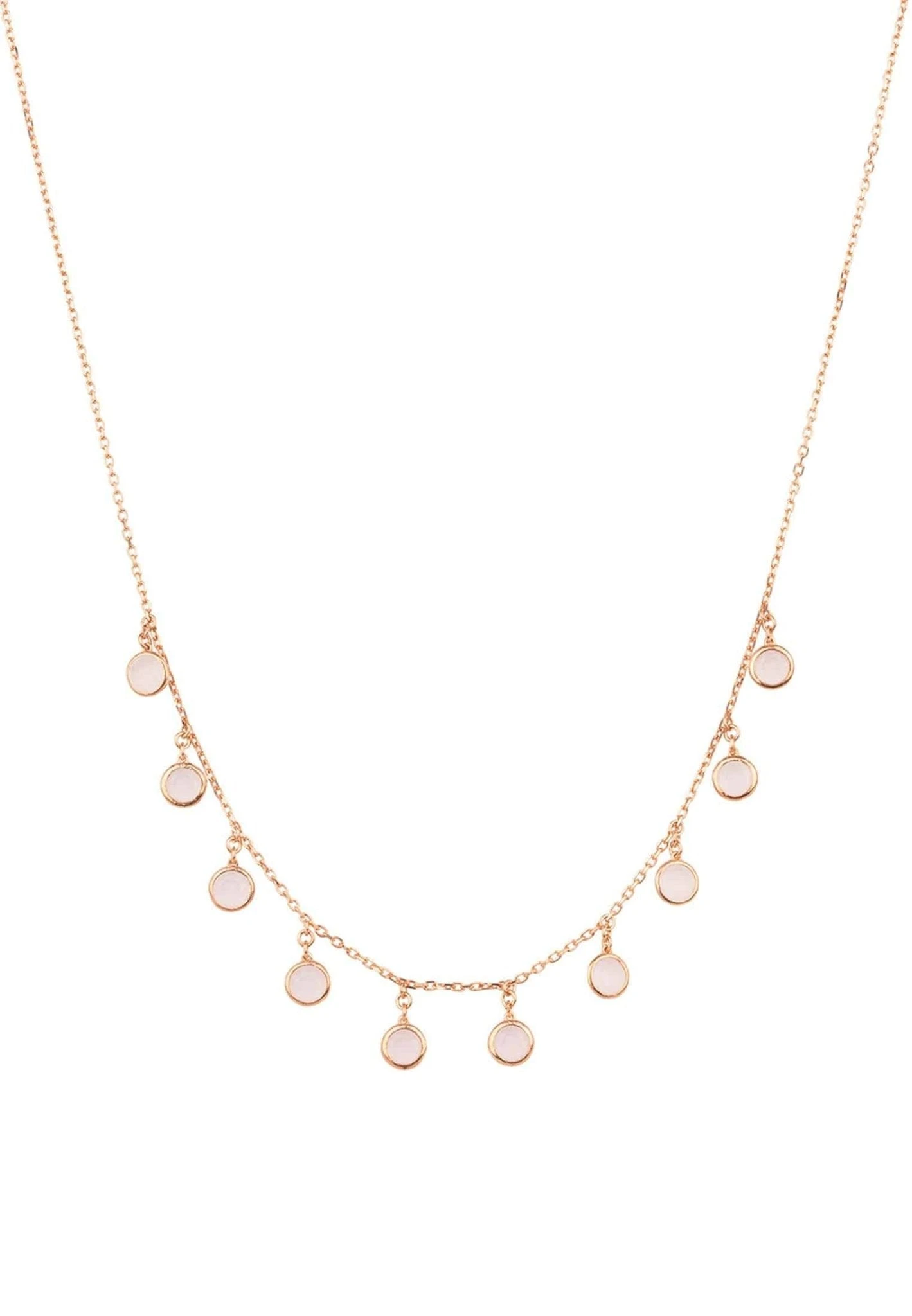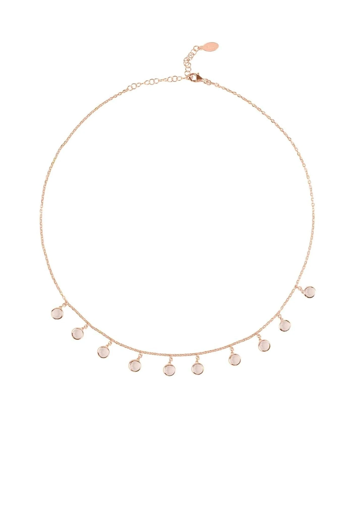 The Florence round gemstone necklace rosegold rose quartz is a beautiful and stylish piece of jewellery that sparkles and catches the light beautifully. This necklace features rose quartz gemstones in a feminine and stylish design, perfect for any outfit. The round cut gemstones are spaced evenly on a fine chain and are set in 925 sterling silver that has been dipped in 22ct rosegold. The necklace also features a lobster clasp and size adjuster for ease of wear.