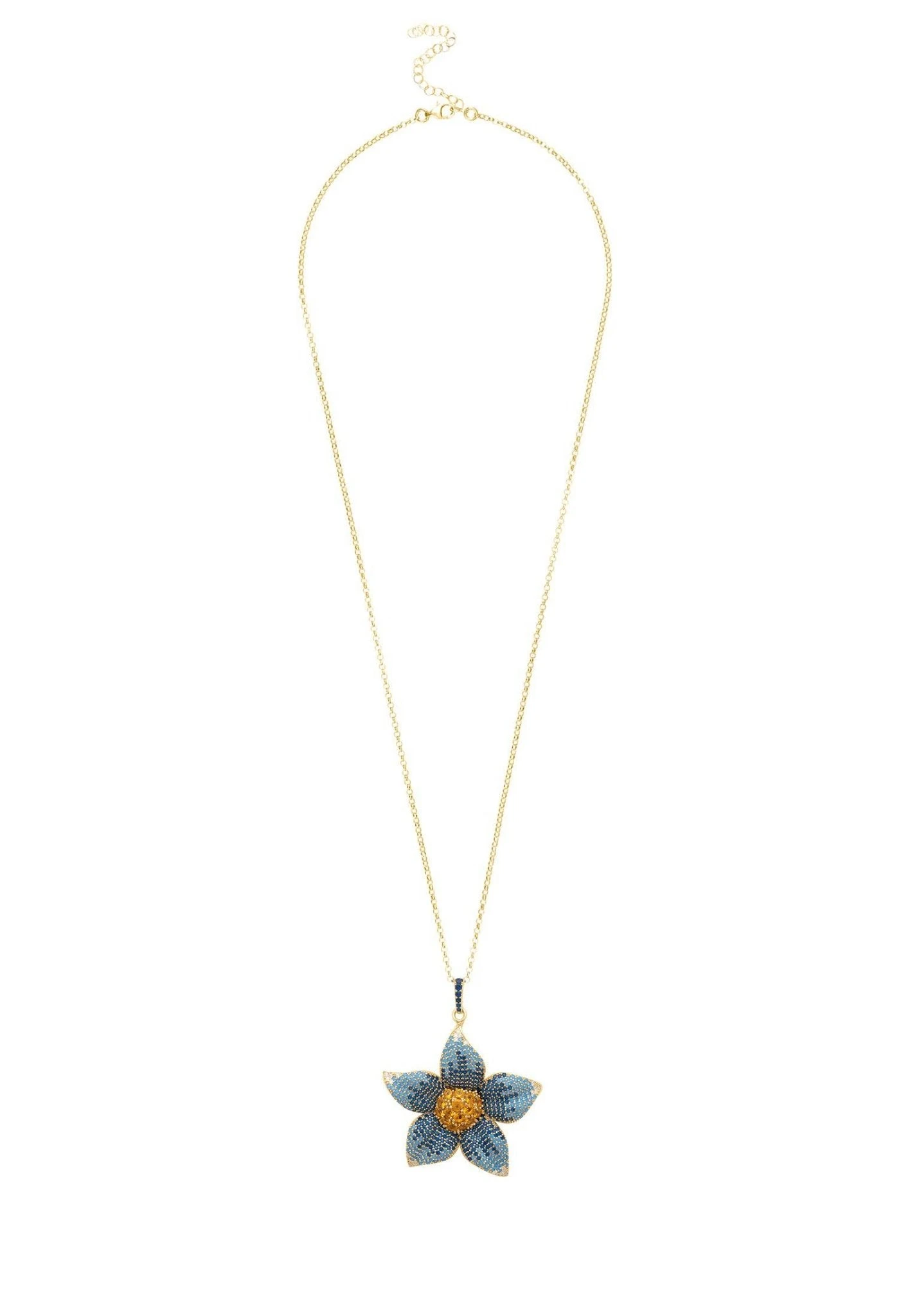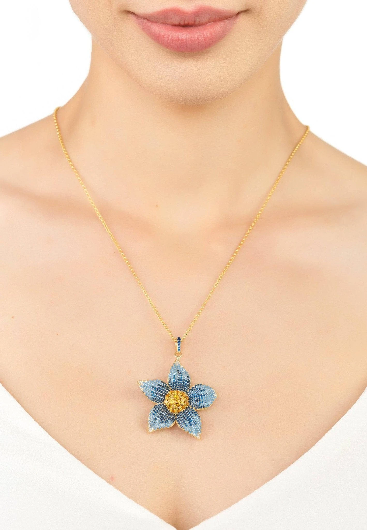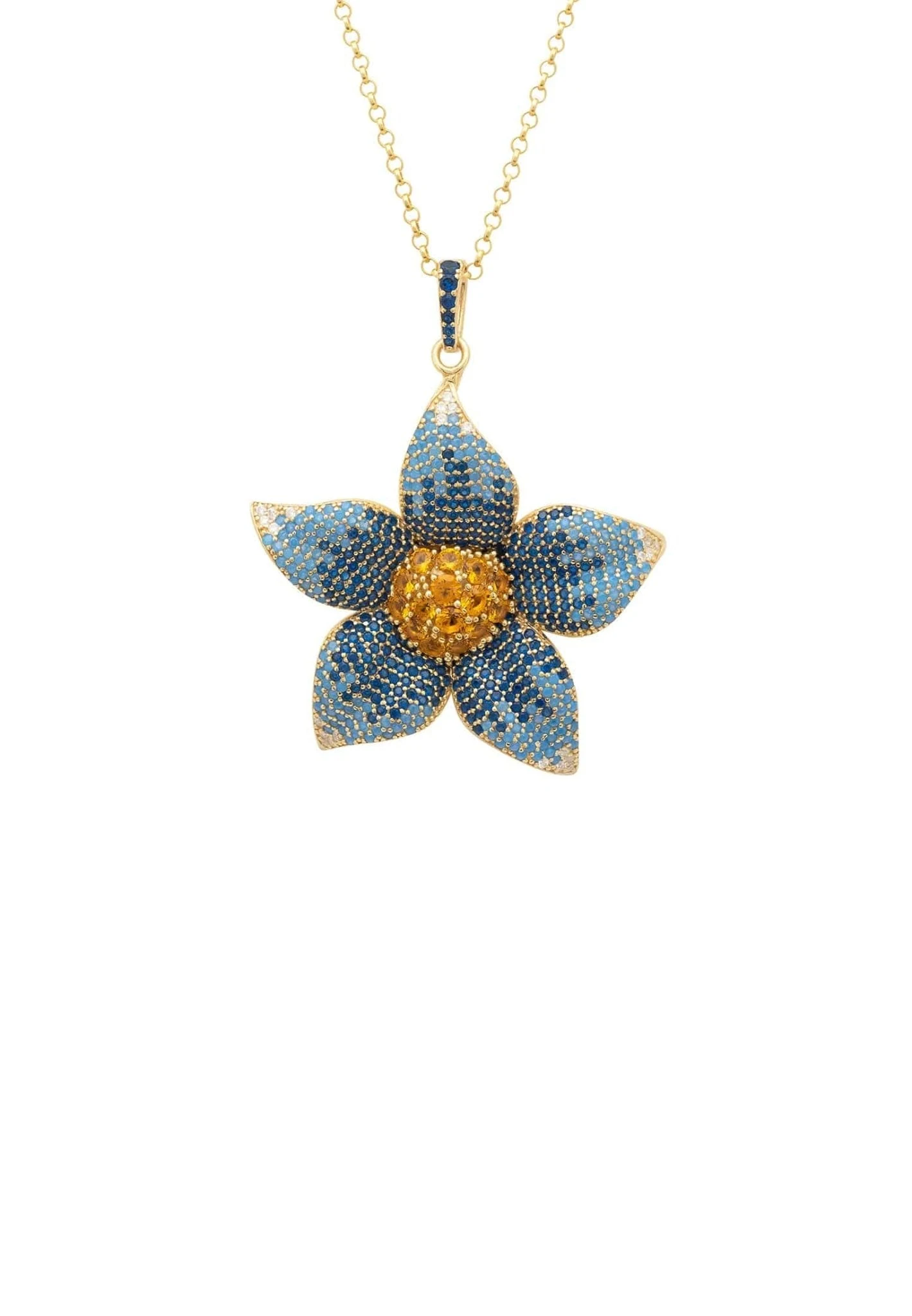 This large forget me not pendant style necklace is adorned with sparkling cubic zirconia, with graduated shades of blue through to white on the petals and vibrant yellow at its centre along with a zircon adorned bail, that allows the chain to move freely through, made in a three dimensional style for added interest, which will add a touch of sophisticated style to any outfit.