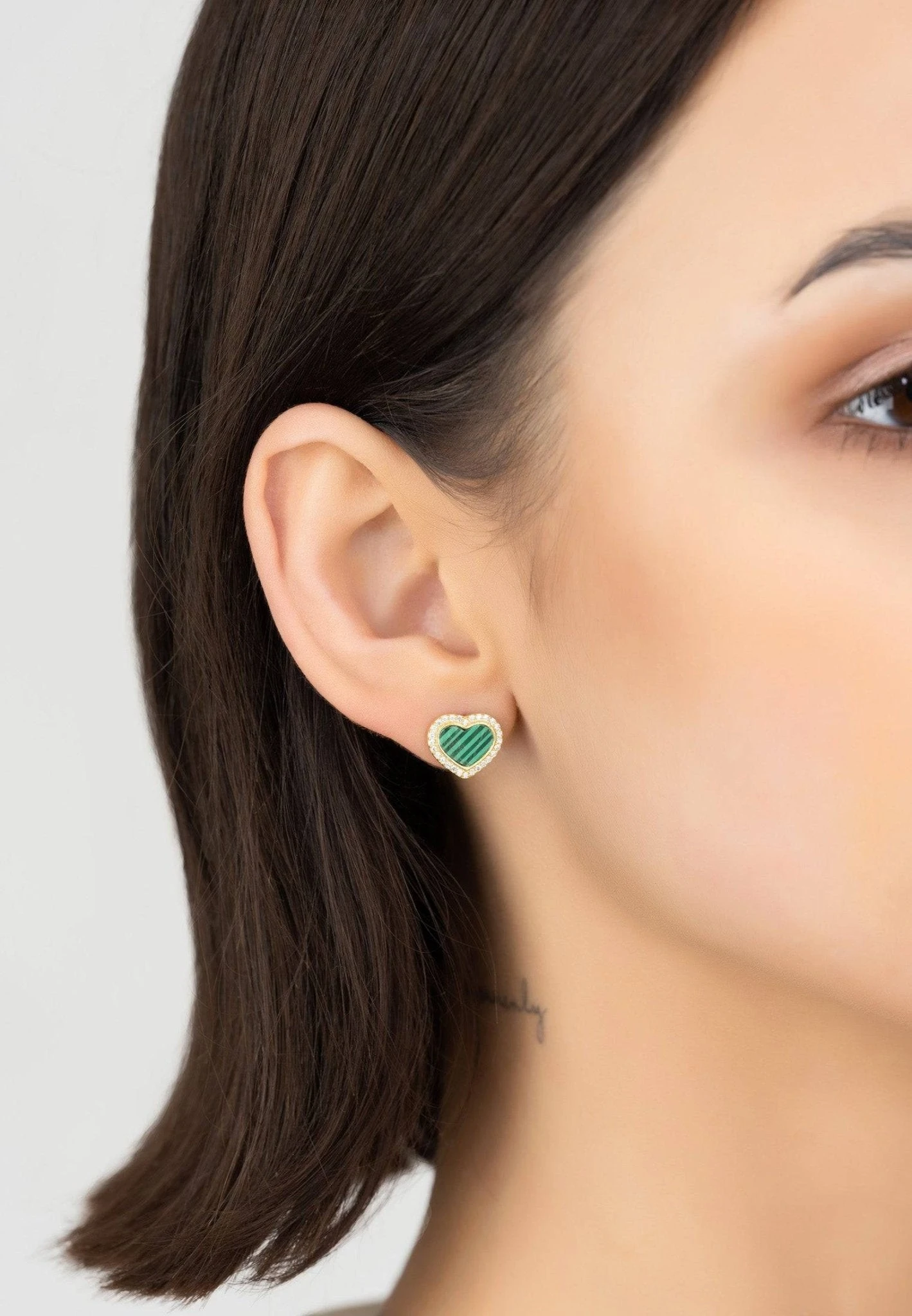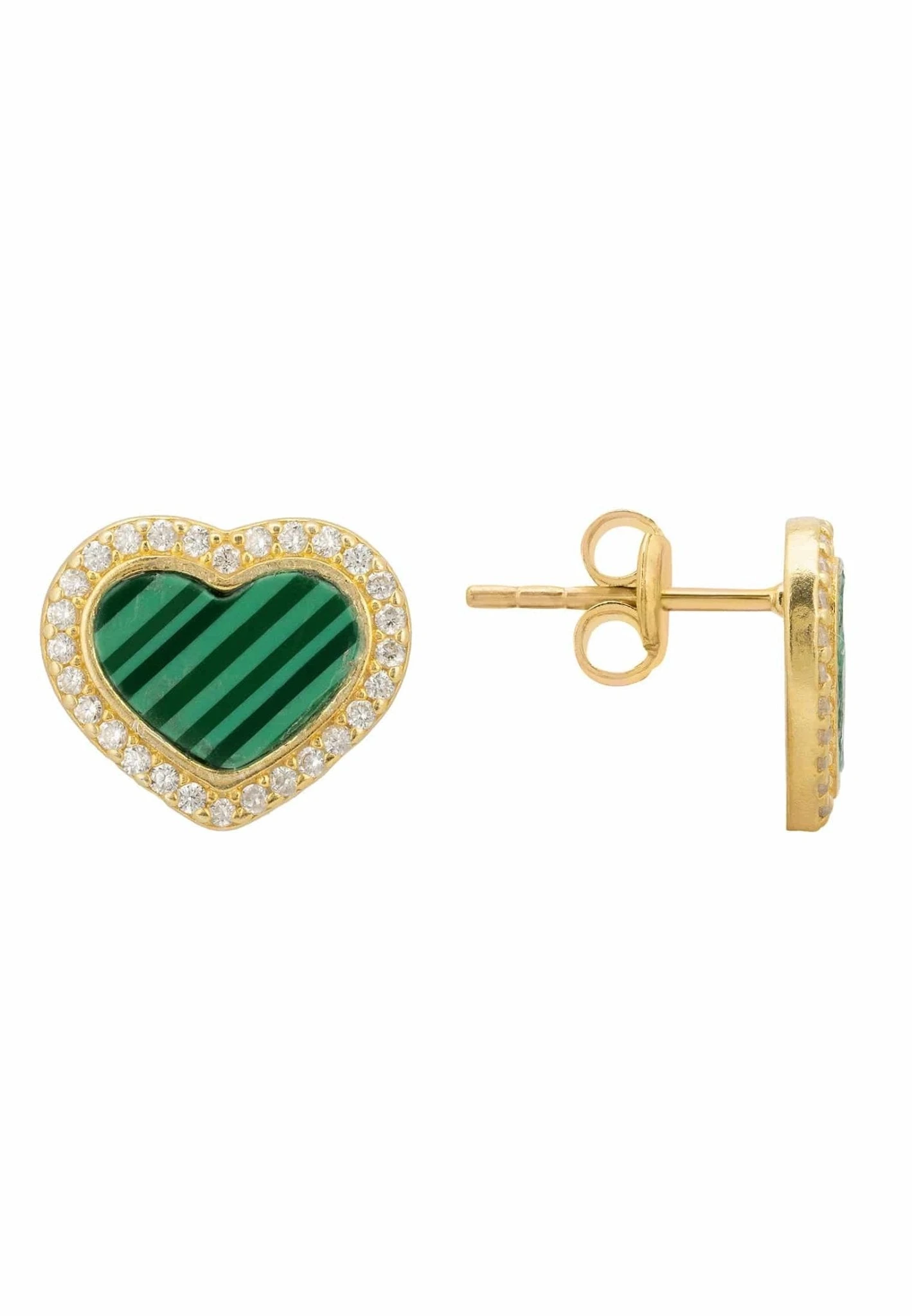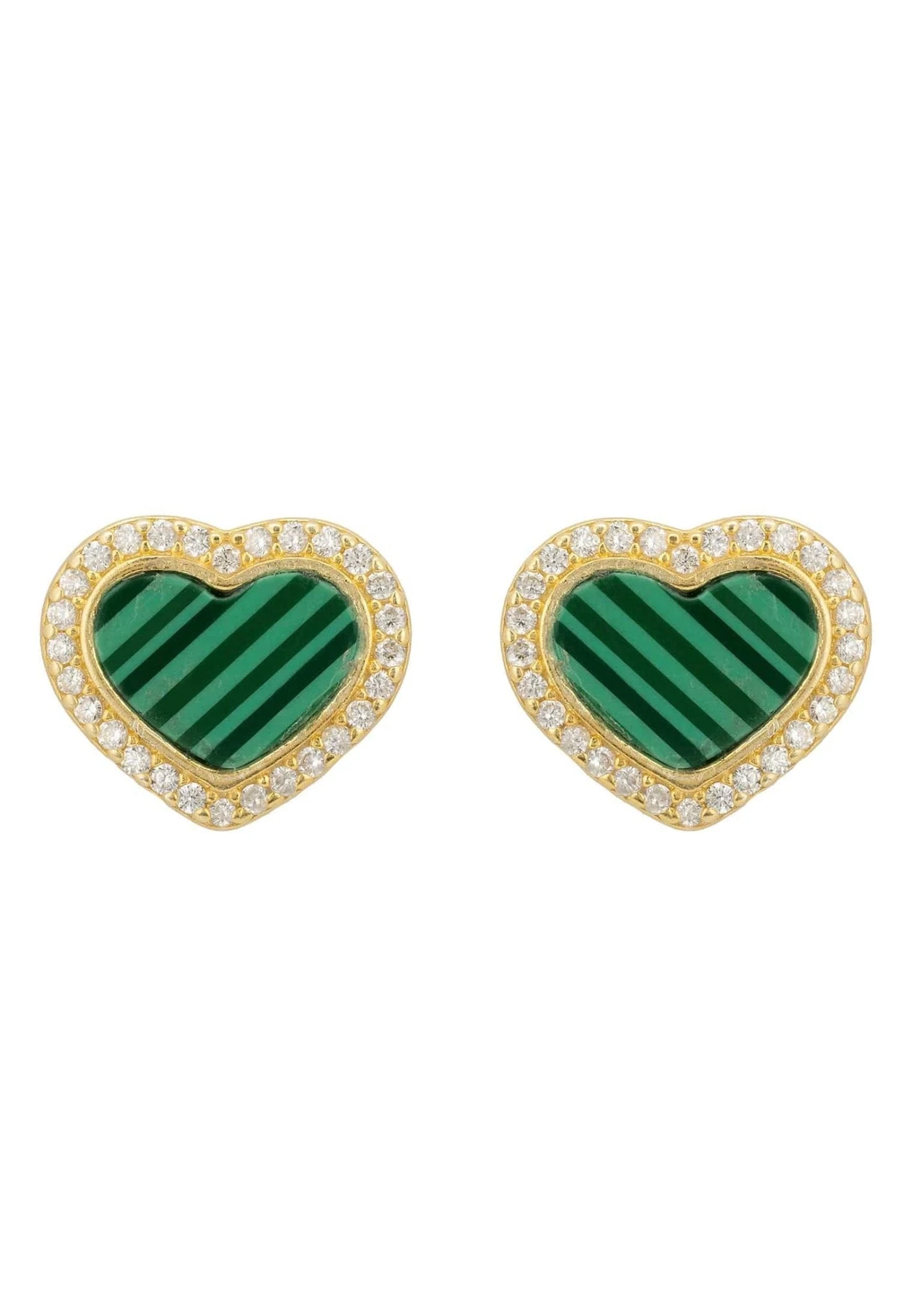 Great for everyday styling these earrings feature two hearts set with a heart shaped slice of green Malachite and outlined with fine white zircons.