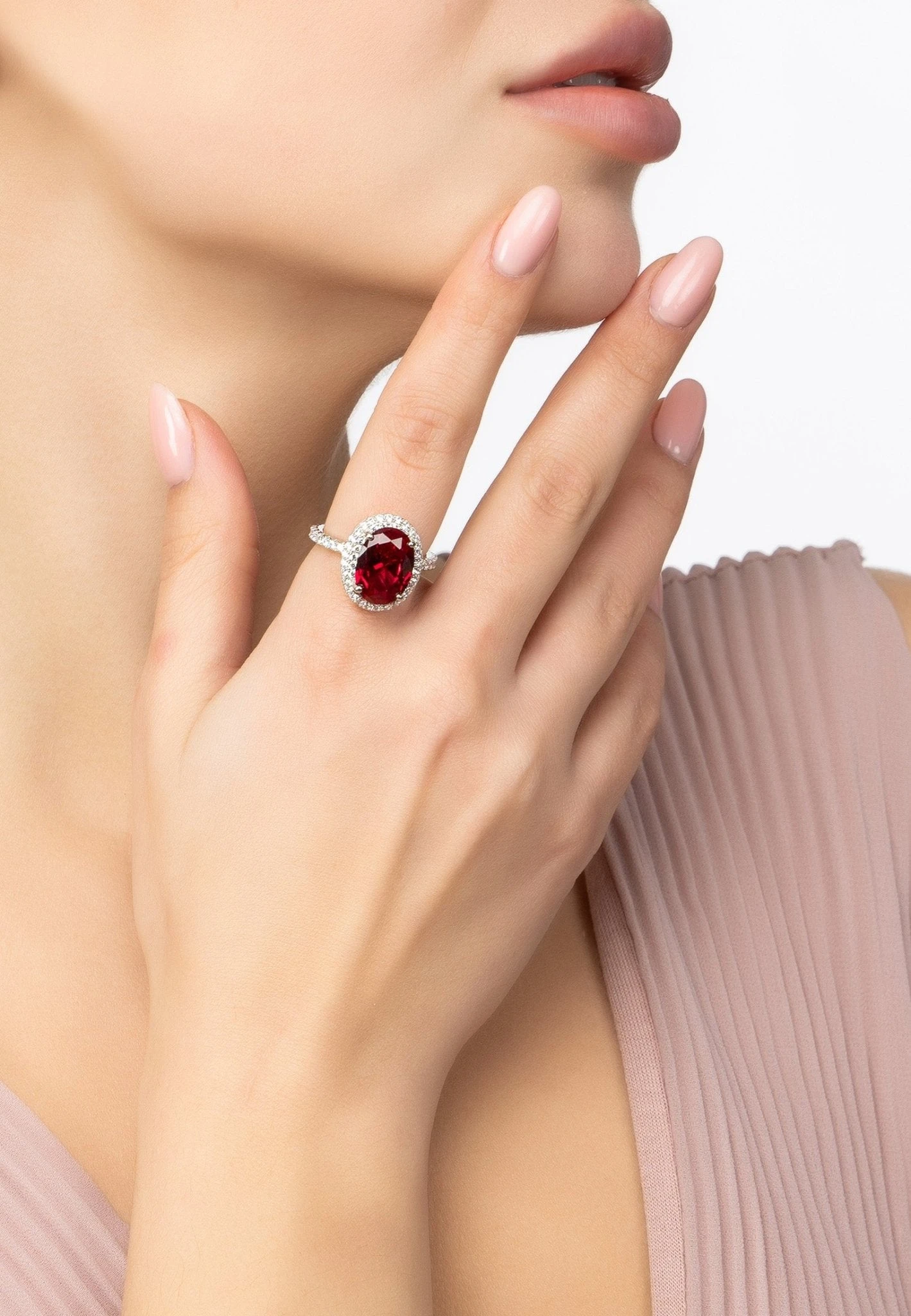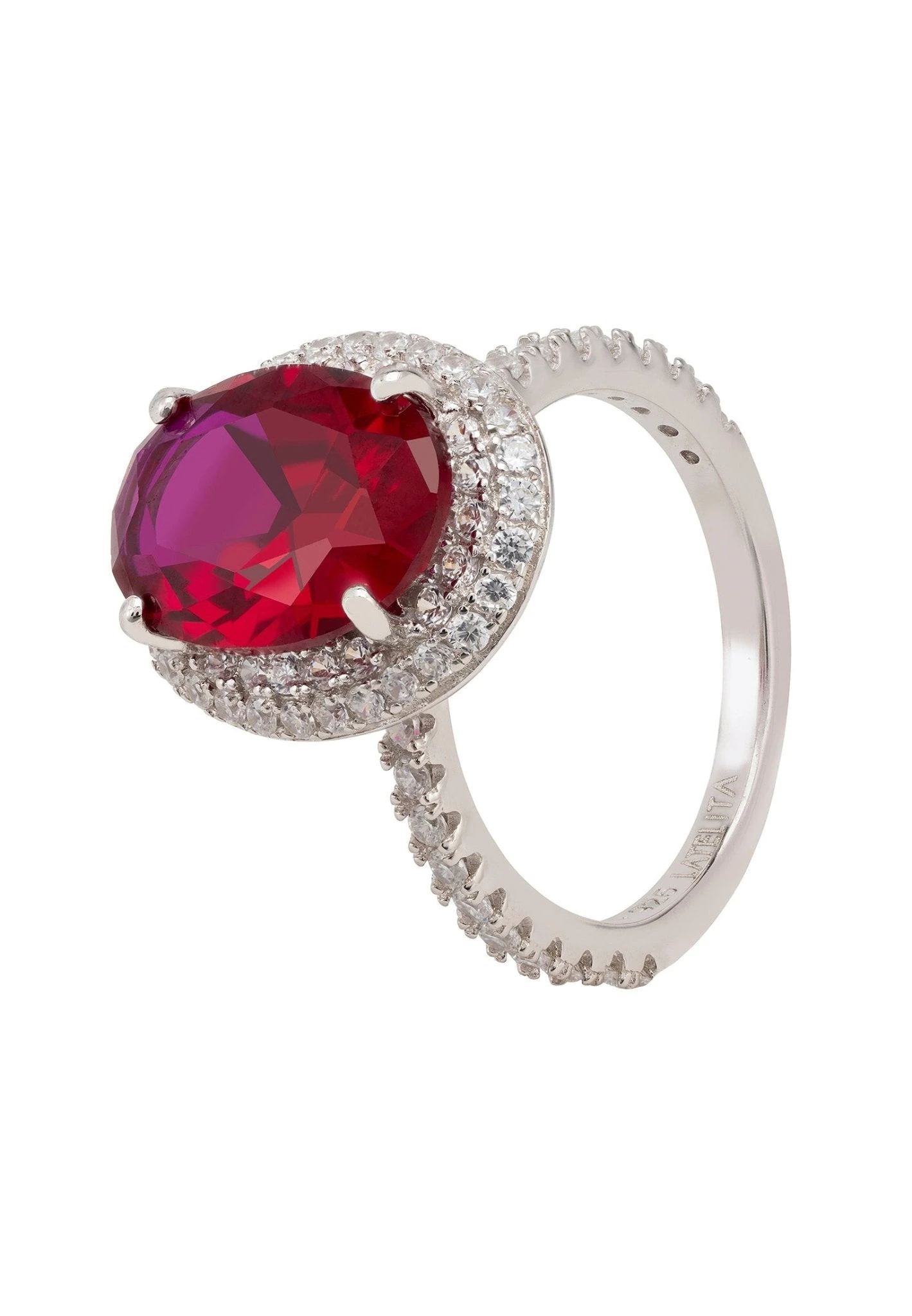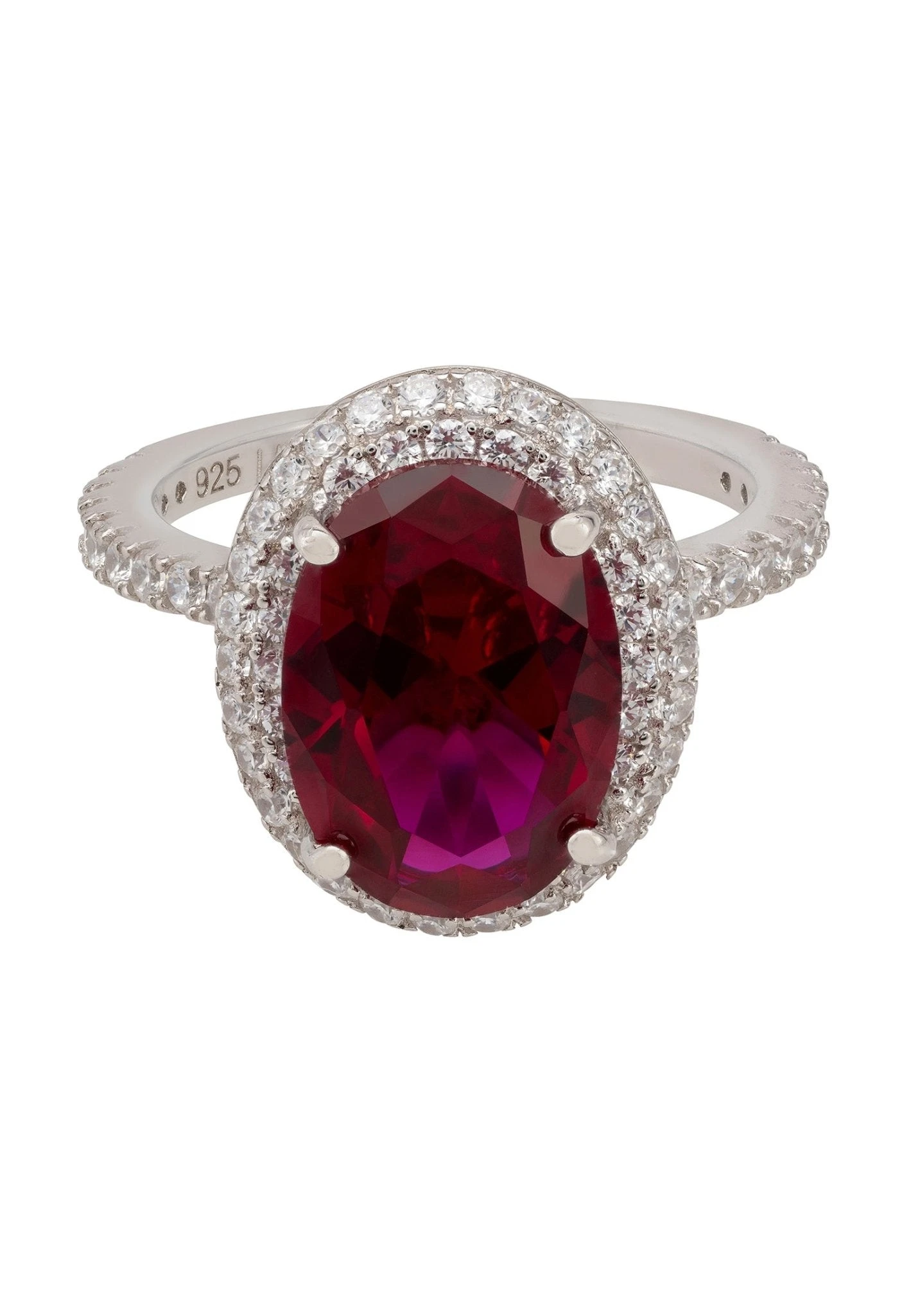 Handcrafted from 925 sterling silver with an intricate cut-out setting, featuring a beautiful oval ruby gemstone surrounded by a double row of sparkling simulated diamonds that are also set halfway down the band of the ring. And if that wasn’t enough sparkle there are more simulated diamonds decorating the underside of the setting to create a more dazzling effect.