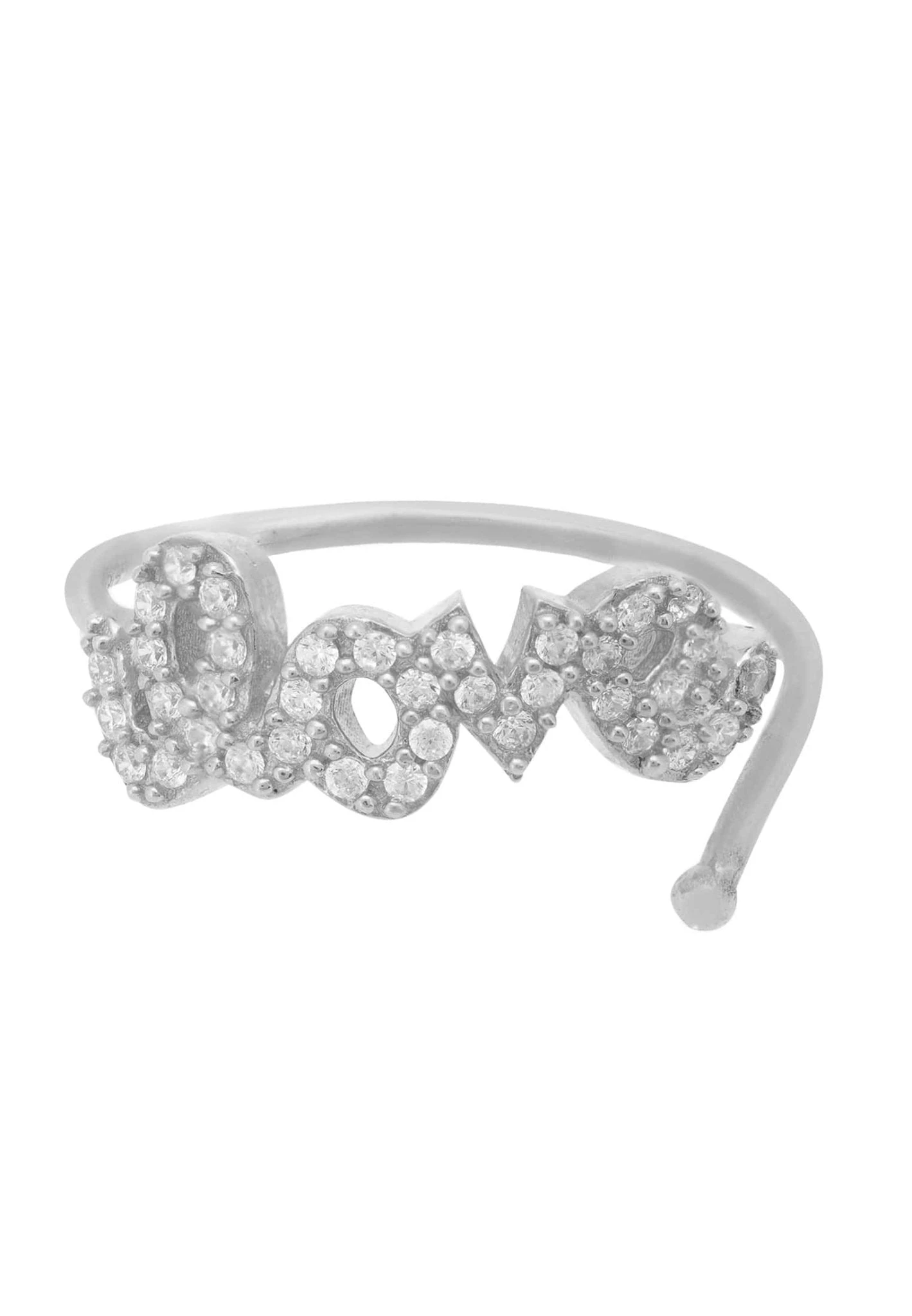 Our love midi ring offers a sophisticated finishing touch to any outfit. With the word love spelt out and adorned with white zircons, this pretty ring has very slight adjustability which allows it to be worn as a conventional pinky ring or as a midi ring. Looks great on its own or create your own unique style by stacking with other rings.