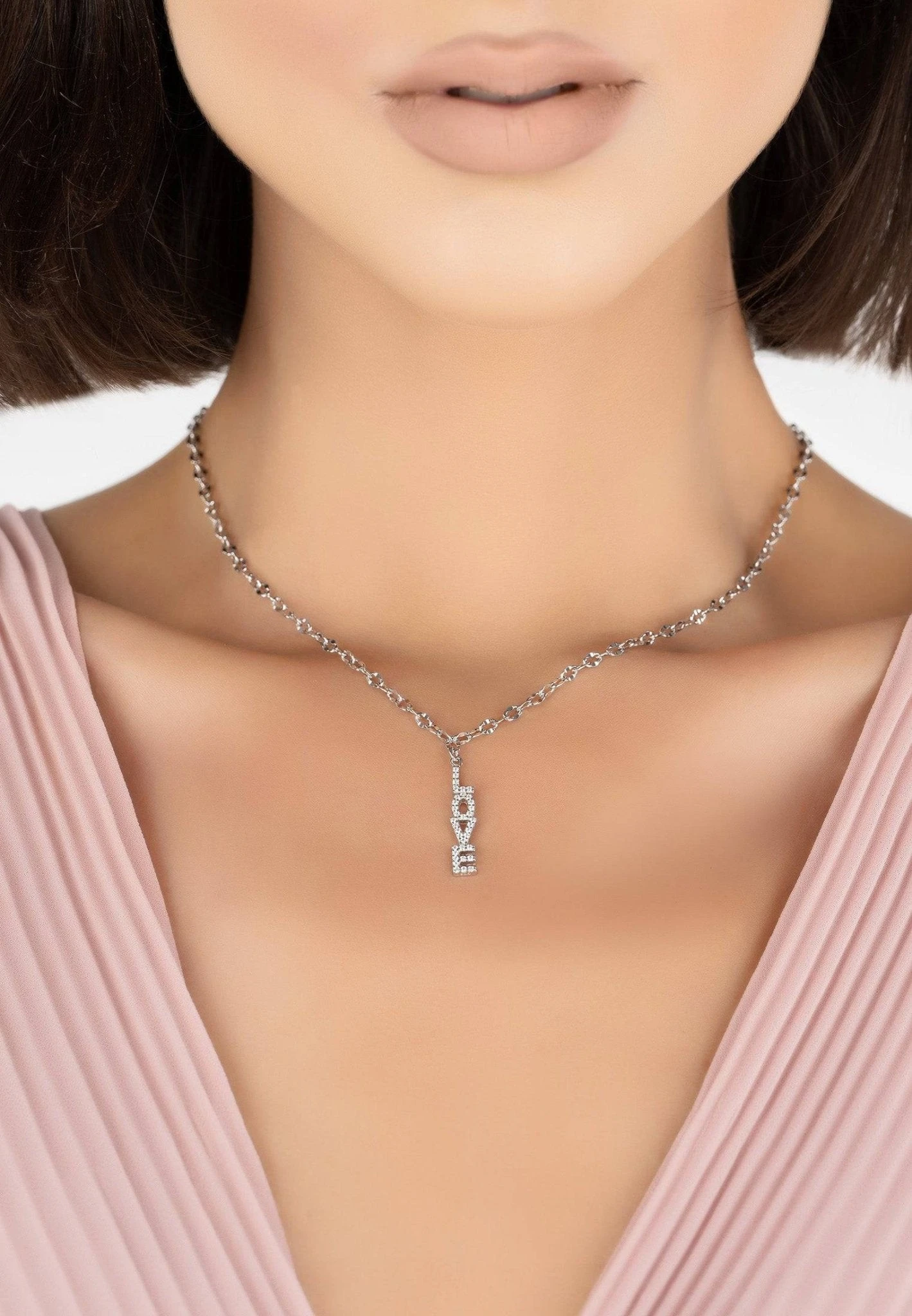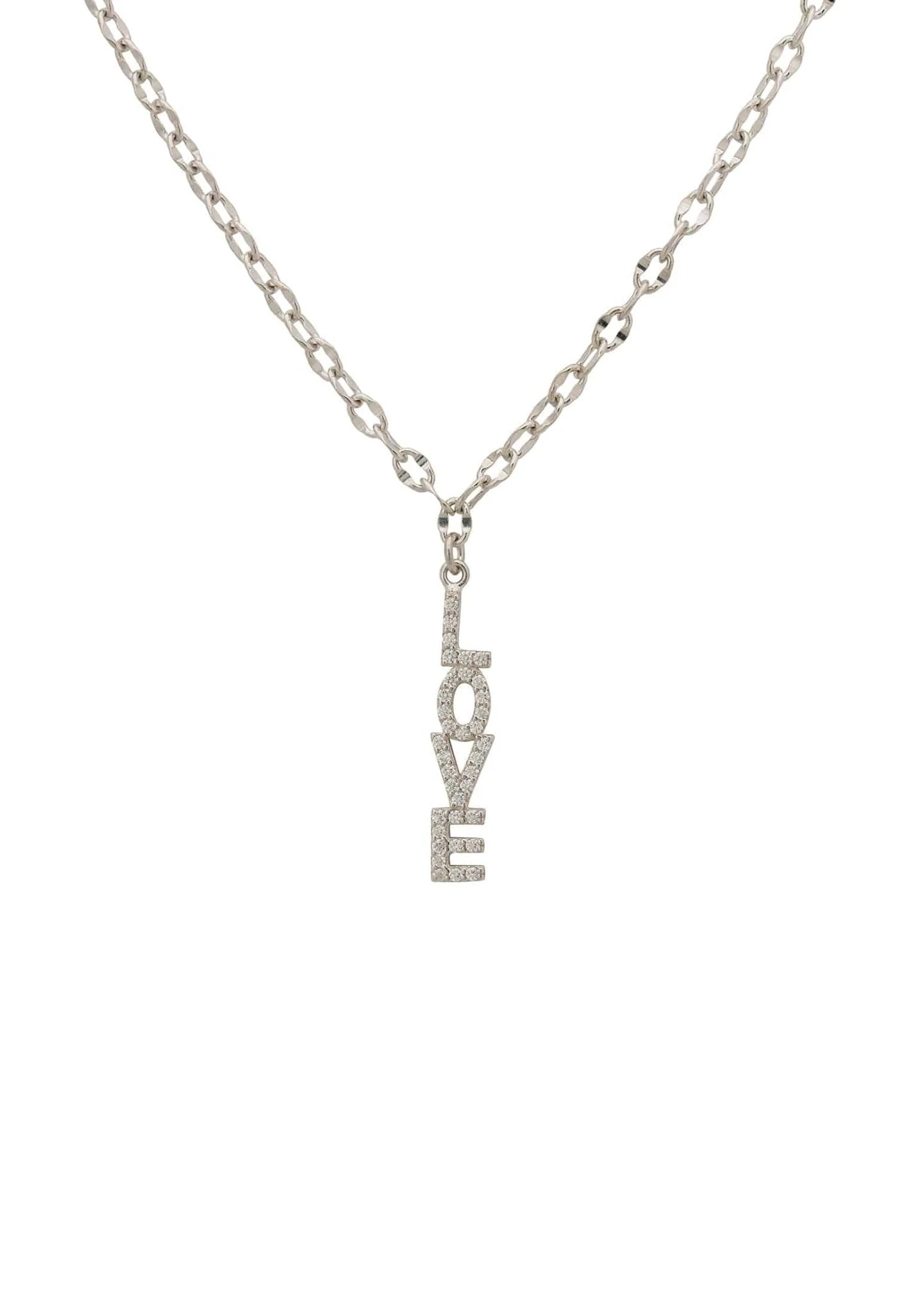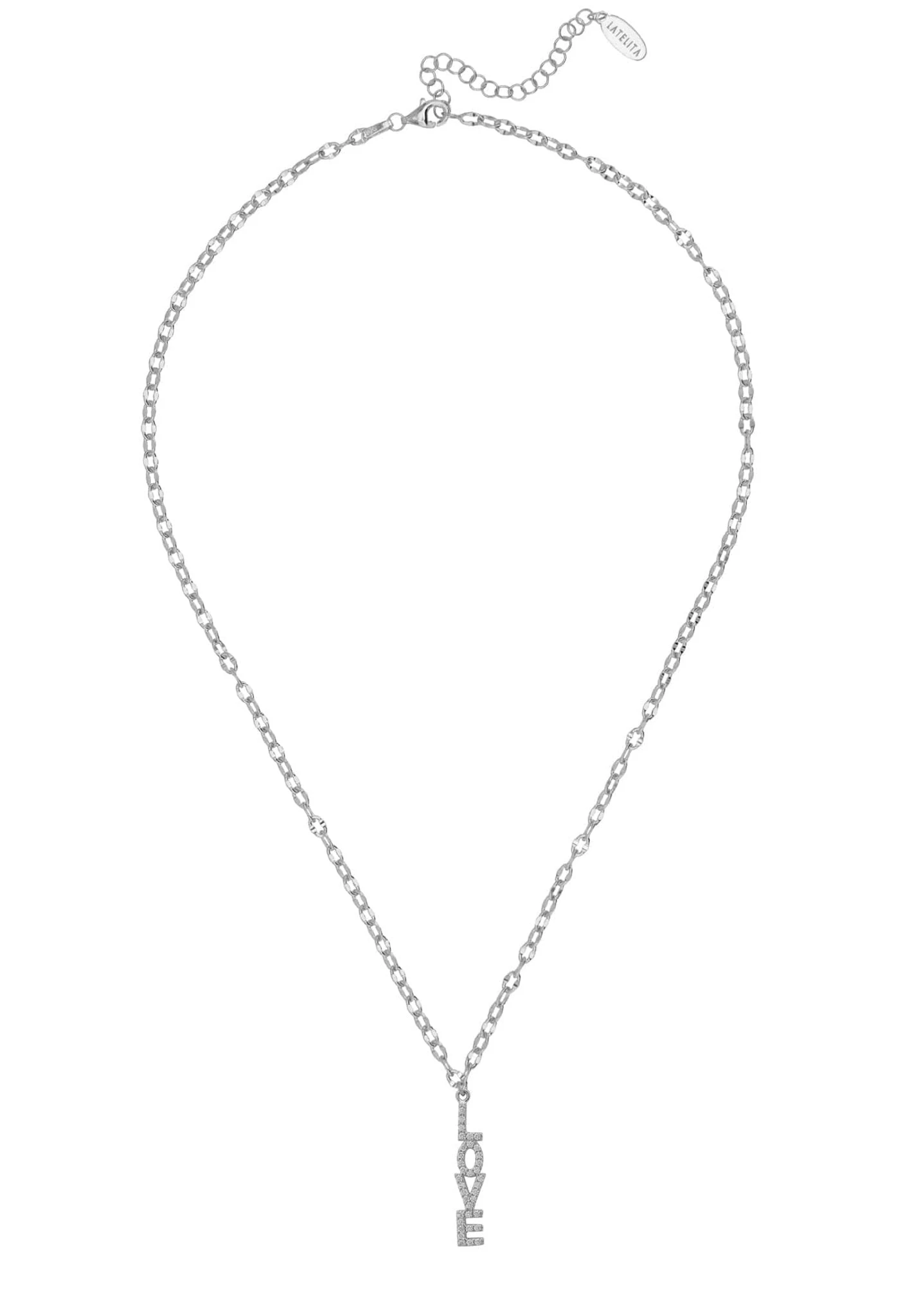 The written word love is adorned with sparkling white cubic zirconia and suspended on a chain. Perfect for those who love delicate jewellery with meaning. The versatility of this necklace means you can wear day or night.