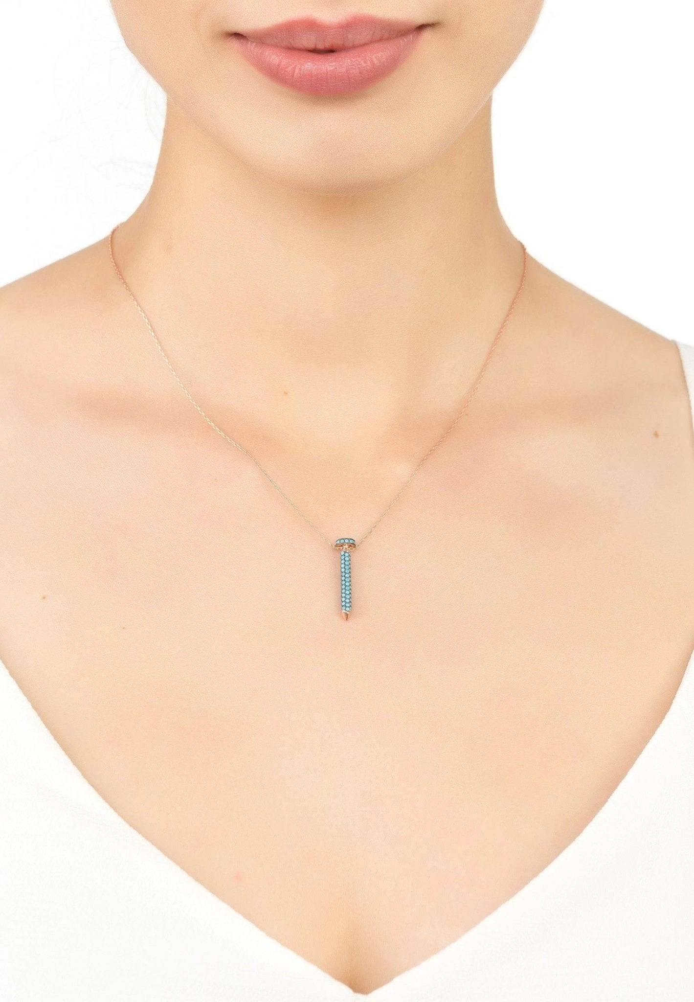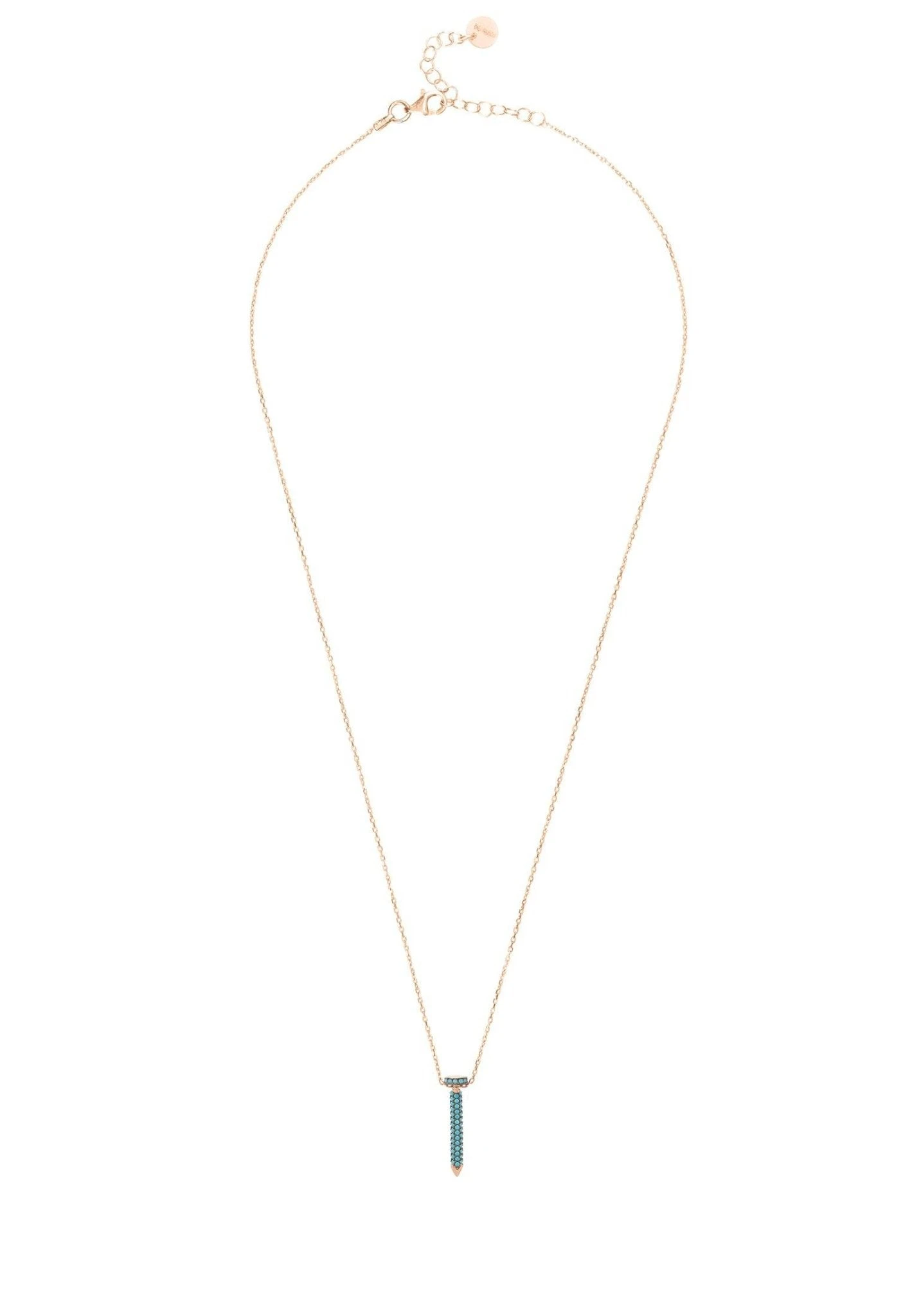 A stylish pendant necklace in the style of a nail covered in turquoise zirconia to inject a pop of colour to complement any outfit. Perfect for the minimalist jewellery wearer who loves colourful jewellery with an element of fun.Â