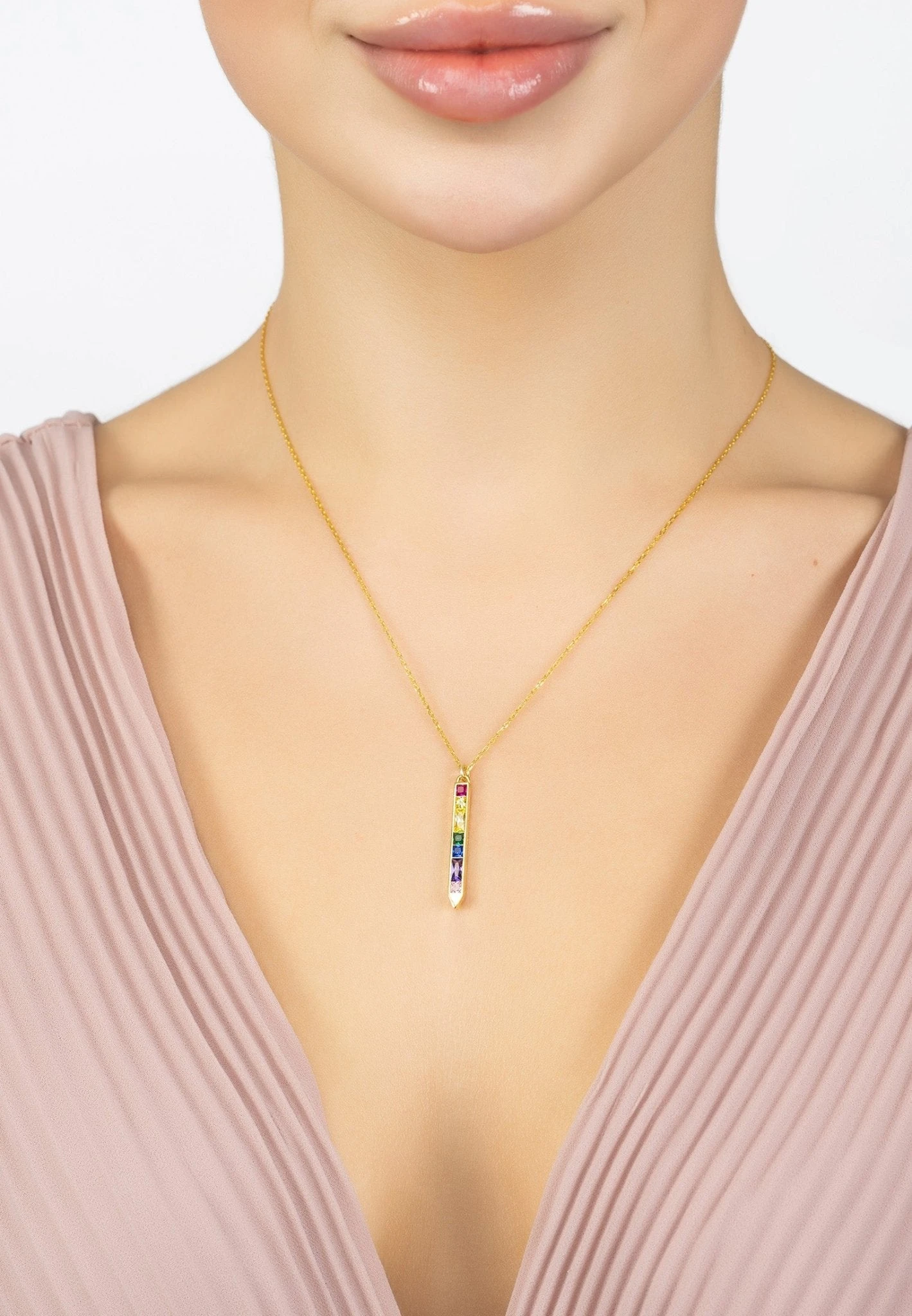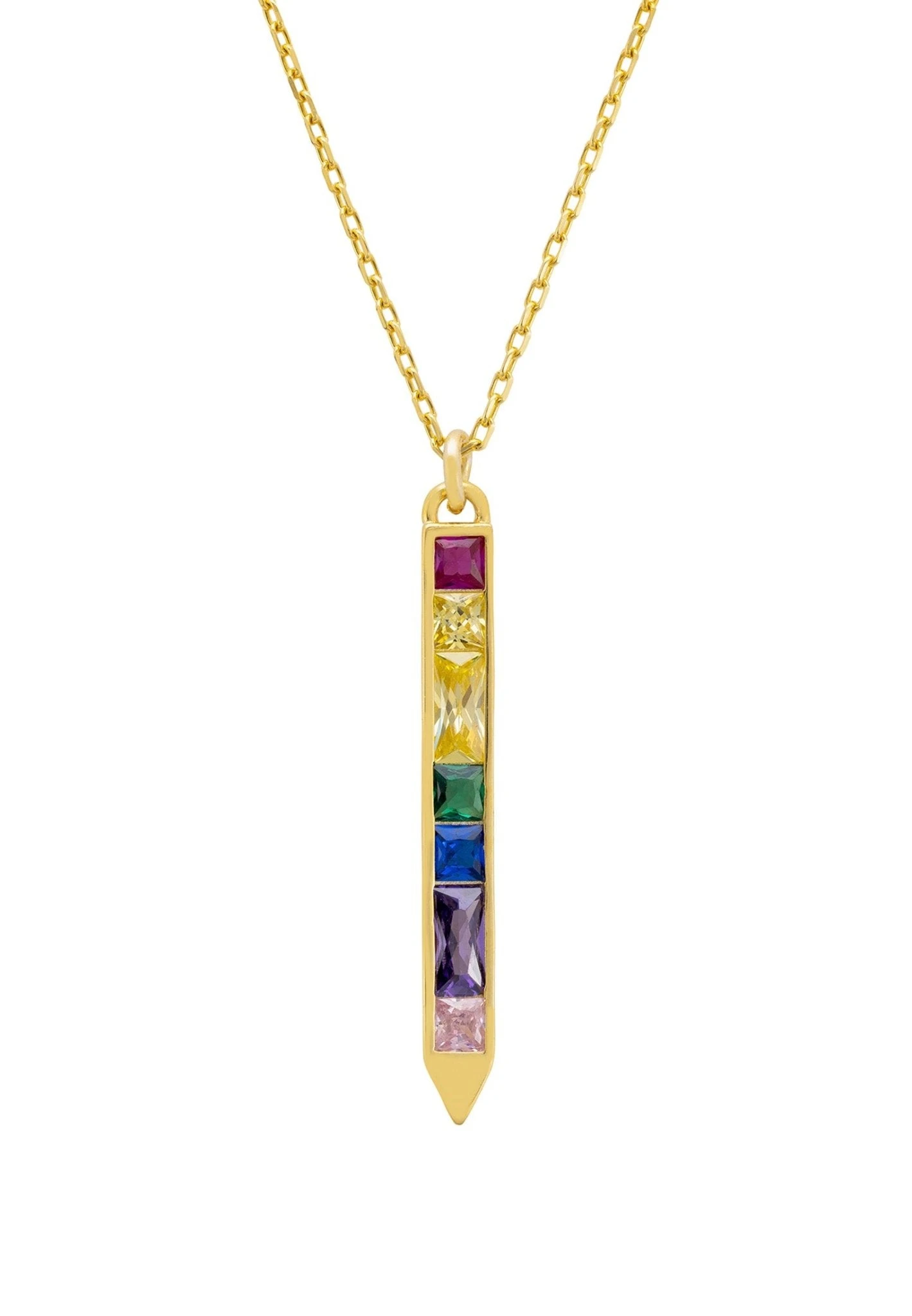 Introducing the Obelisk Rainbow Baguette Pendant Necklace Gold with a dazzling multicoloured shimmer. Show off your bold style and be the envy of all with this unique statement piece.