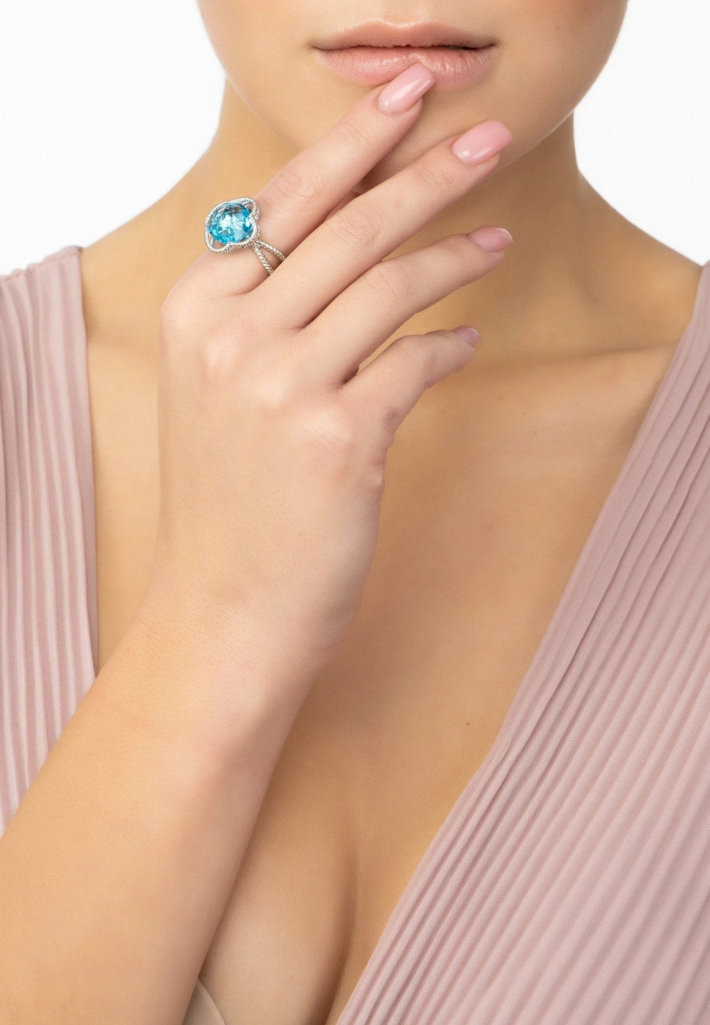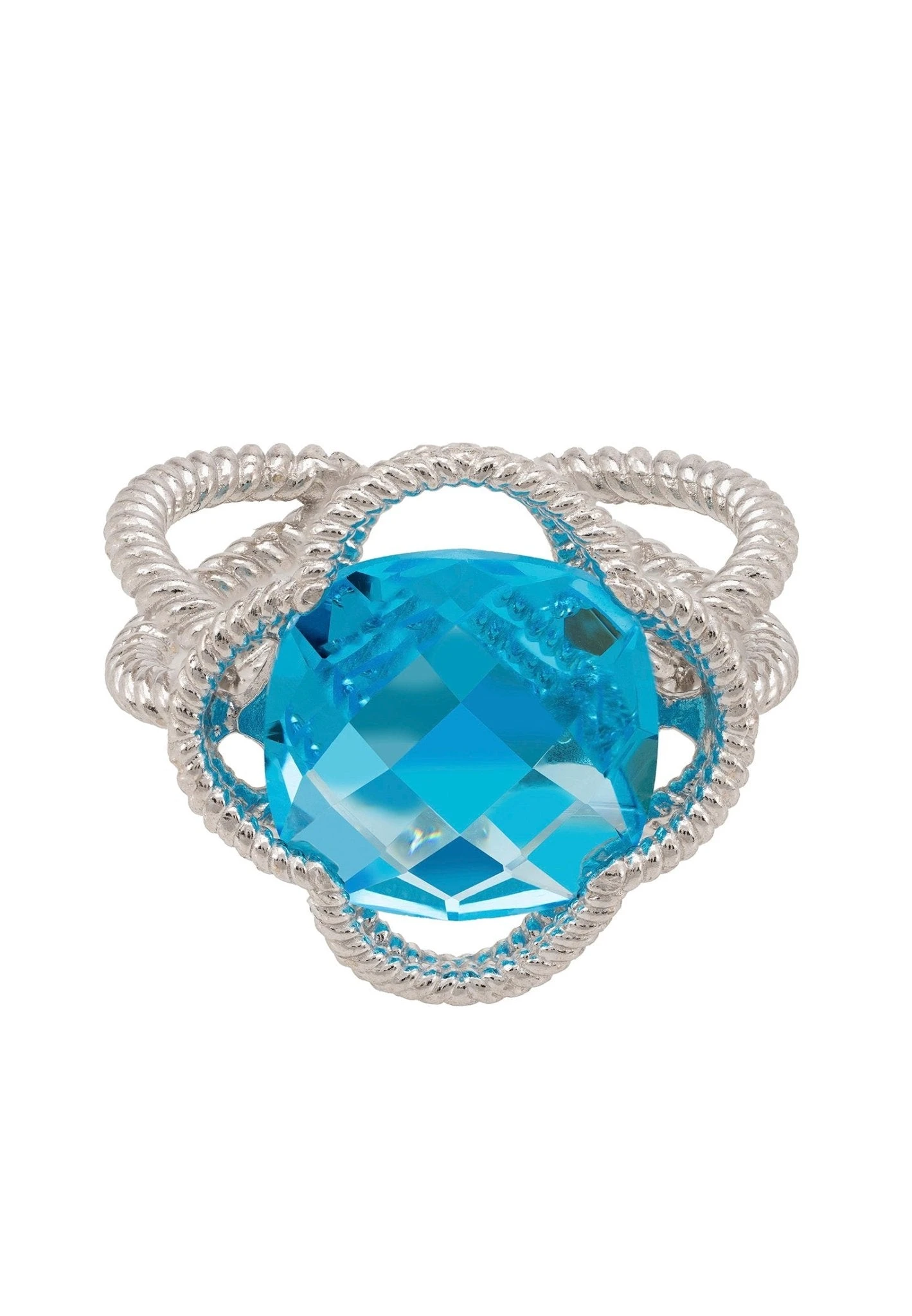 Handcrafted with 925 sterling silver. This ring’s contemporary twist on a classic style comes from its textured metallic elements, which are elegantly twisted. A striking blue topaz gemstone is placed at the centre of the open clover design, making it the perfect accessory for anyone who loves to add colour and glamour to an outfit.