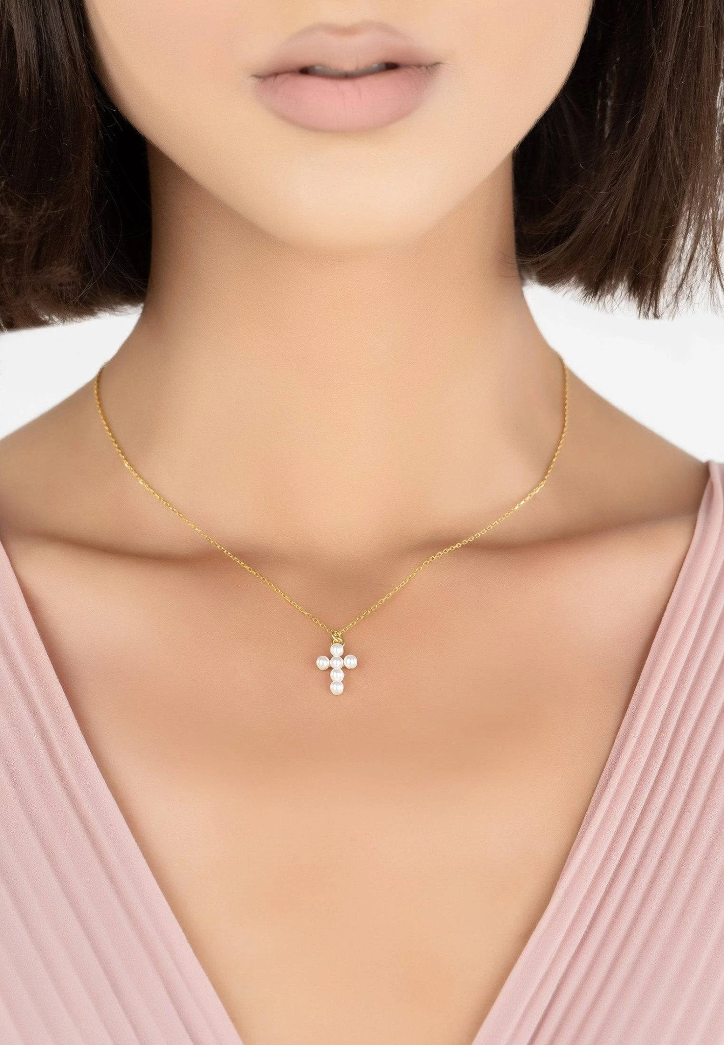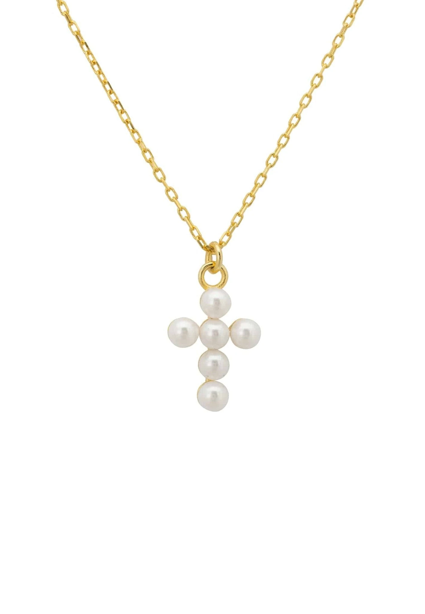 The pearl cross necklace is ideal for those who covet delicate jewellery. Featuring a cross adorned with small white pearls suspended from a fine chain.