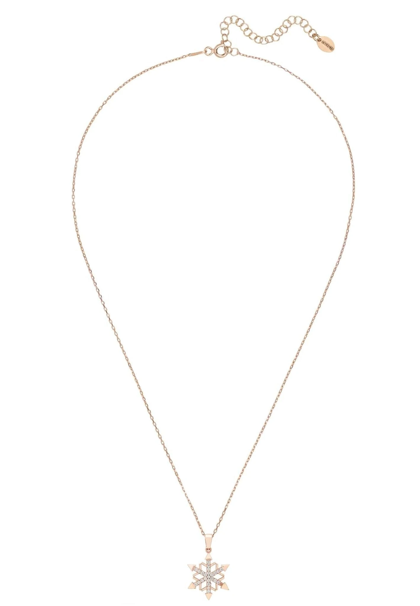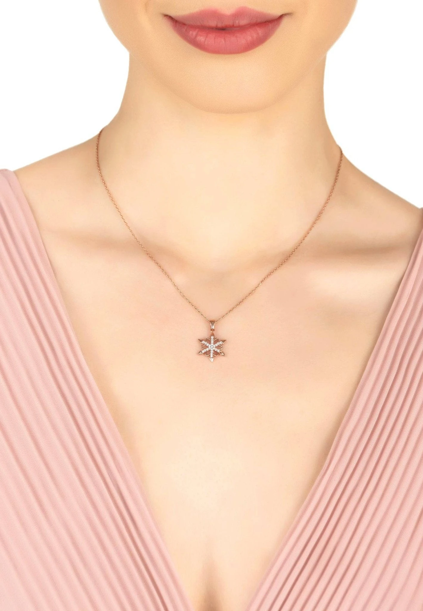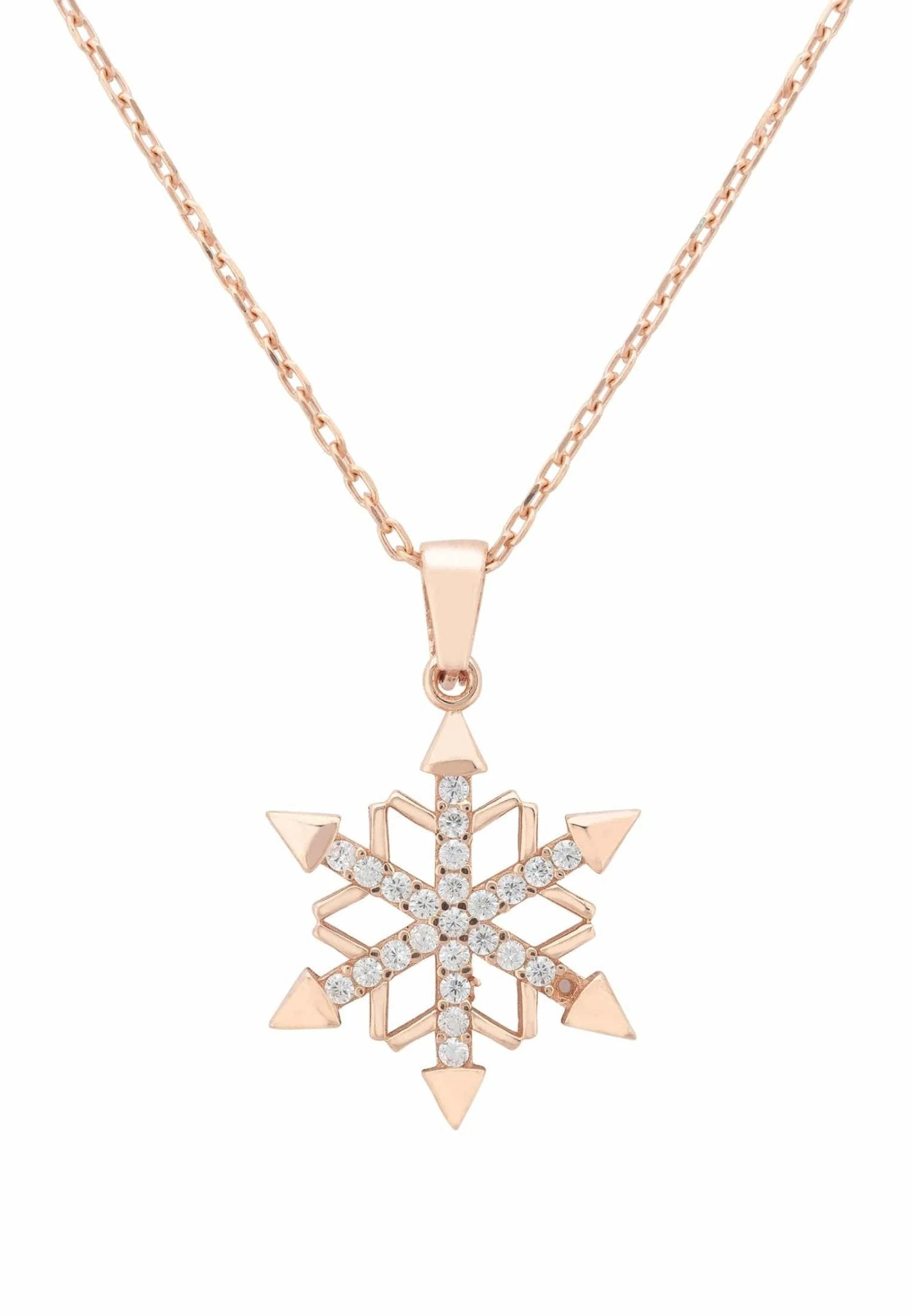 The delicate six pronged snowflake motif is decorated with white zirconia at its centre for added sparkle with the pronged points left to a highly polished metallic finish, all suspended on a fine chain from a metallic bail.