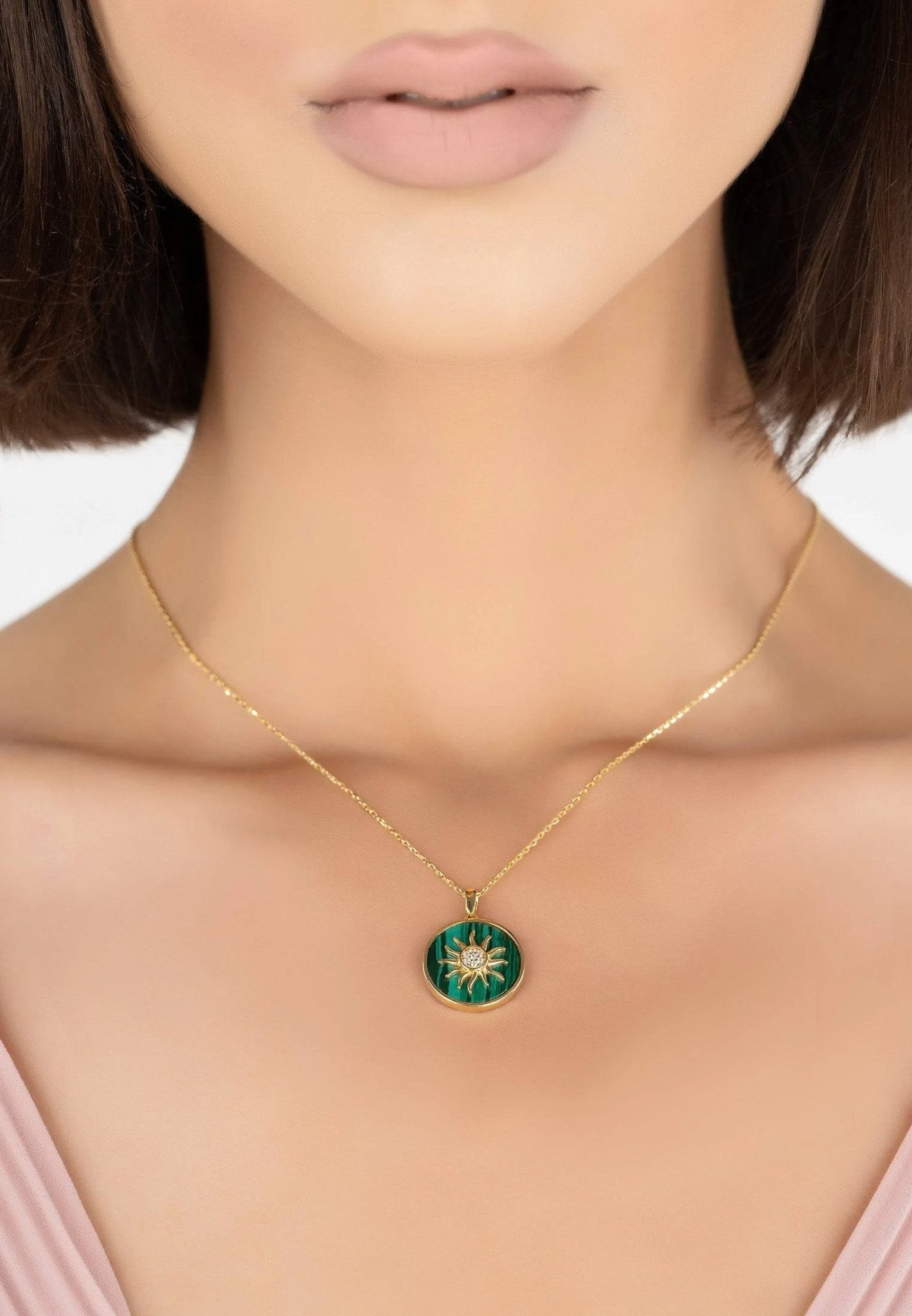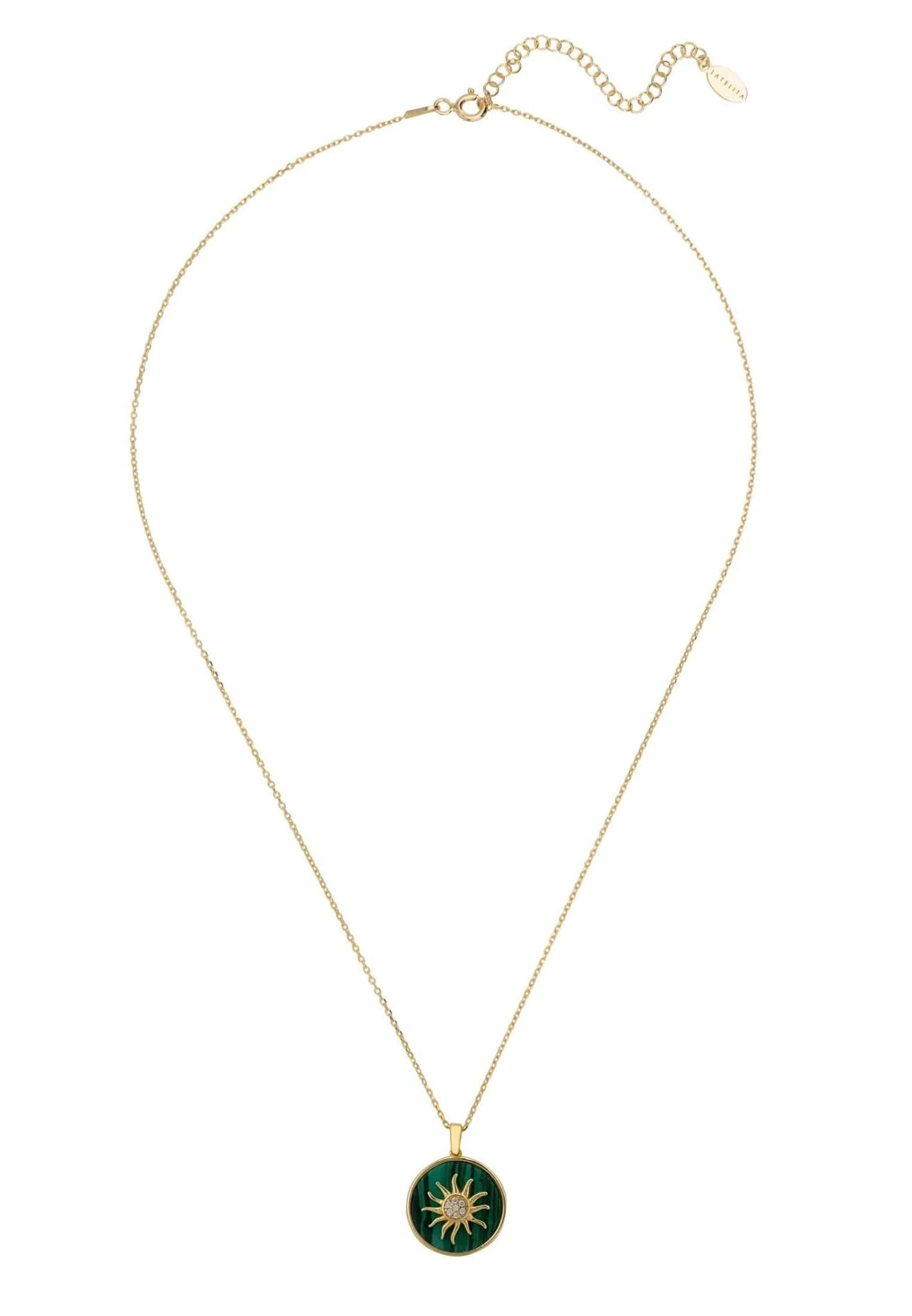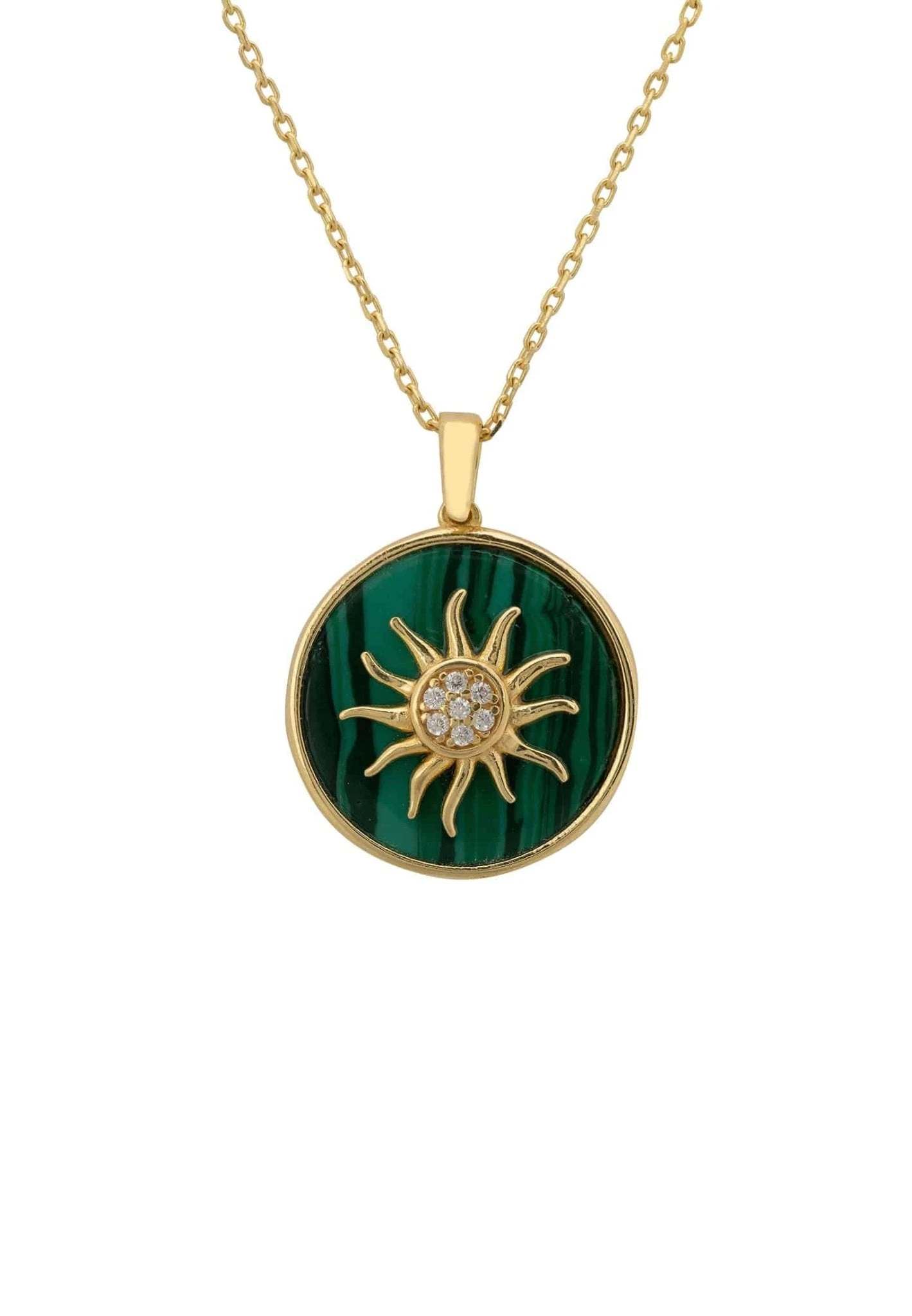 This elegant and chic natural round green Malachite pendant necklace incorporates hand set zircons at the centre of a metallic sunburst design set into a round shaped slice of malachite all encased in a metallic setting.