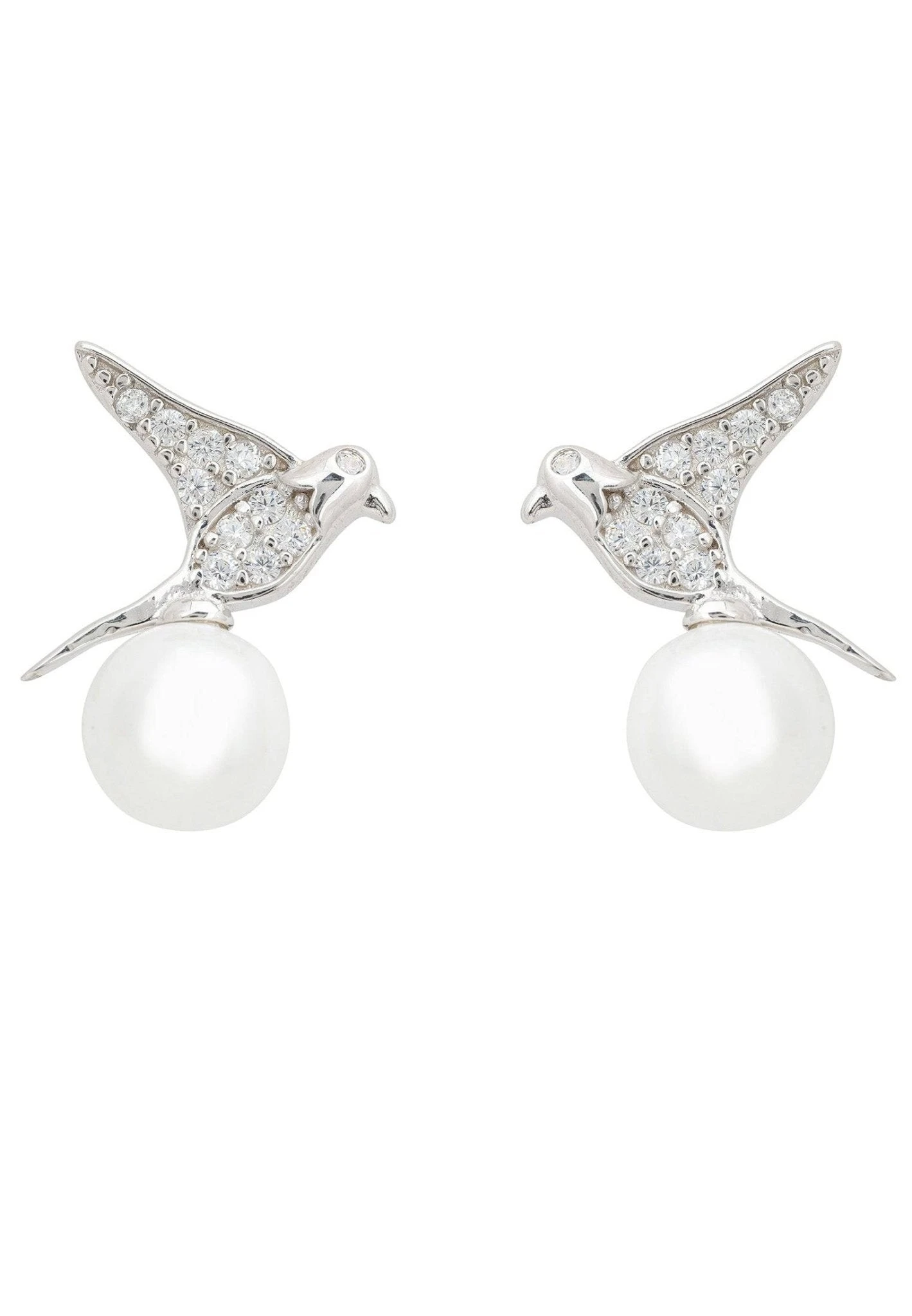 These delicate earrings feature a bird on the wing, adorned with sparkling cubic zirconia and a small pearl attached at its feet, which will add a touch of sophisticated style to any outfit.
