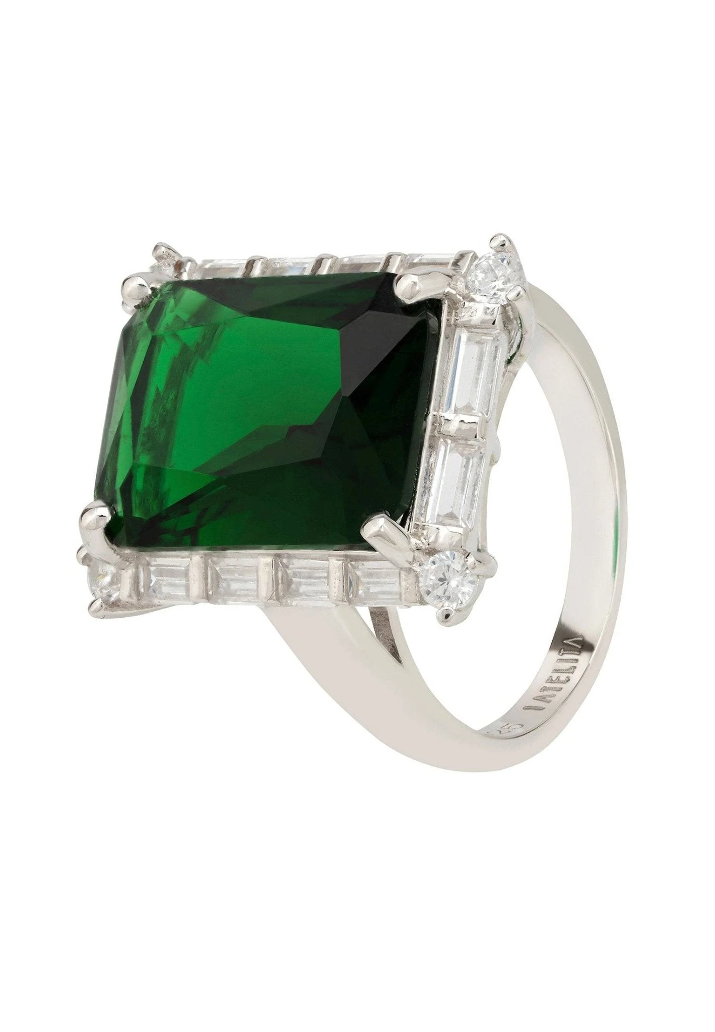 TheĀ beautiful design of theĀ TudorĀ ring, featuresĀ a large rectangular shaped culturedĀ Emerald surrounded in its setting withĀ baguette cutĀ white zircons forĀ added sparkle and glitz.