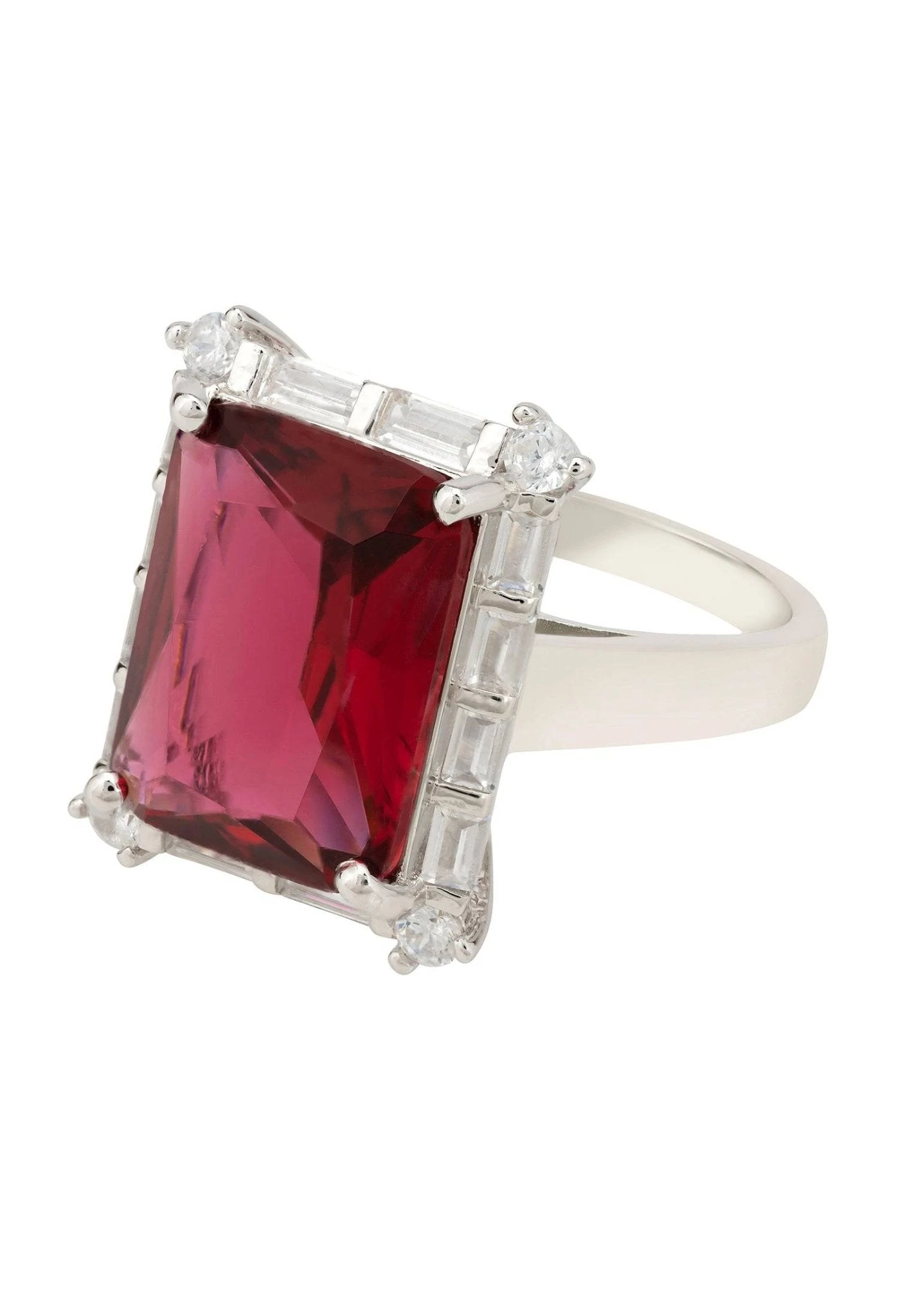 The beautiful design of the Tudor ring, features a large rectangular shaped cultured Ruby surrounded in its setting with baguette cut white zircons for added sparkle and glitz.