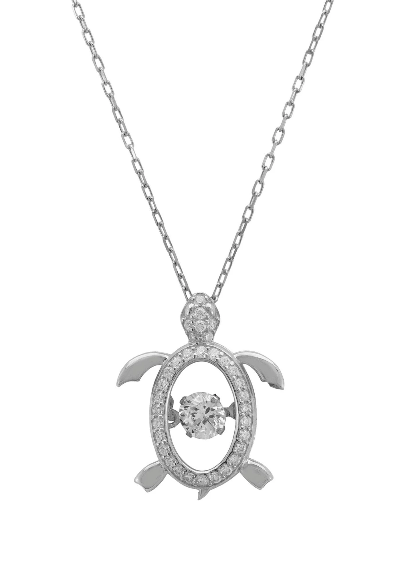 This stunning necklace is crafted with 925 sterling silver. The open design turtle pendant is a breath taking piece of art, embellished with cubic zirconia and featuring one gleaming floating zircon in its centre. Every detail on this exquisite jewellery has been carefully crafted to perfection! The overall look of this piece gives off a feeling of calm serenity, majesty, and strength.