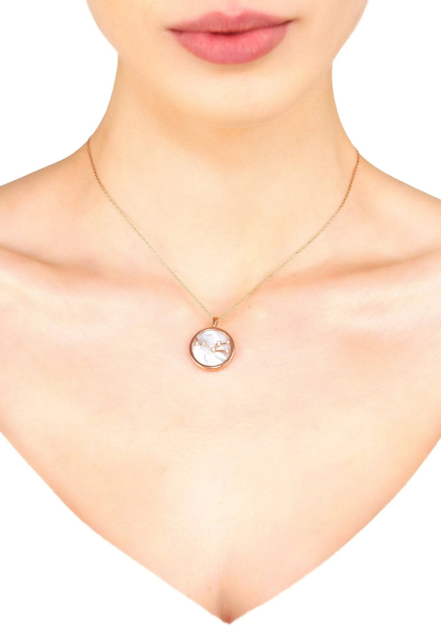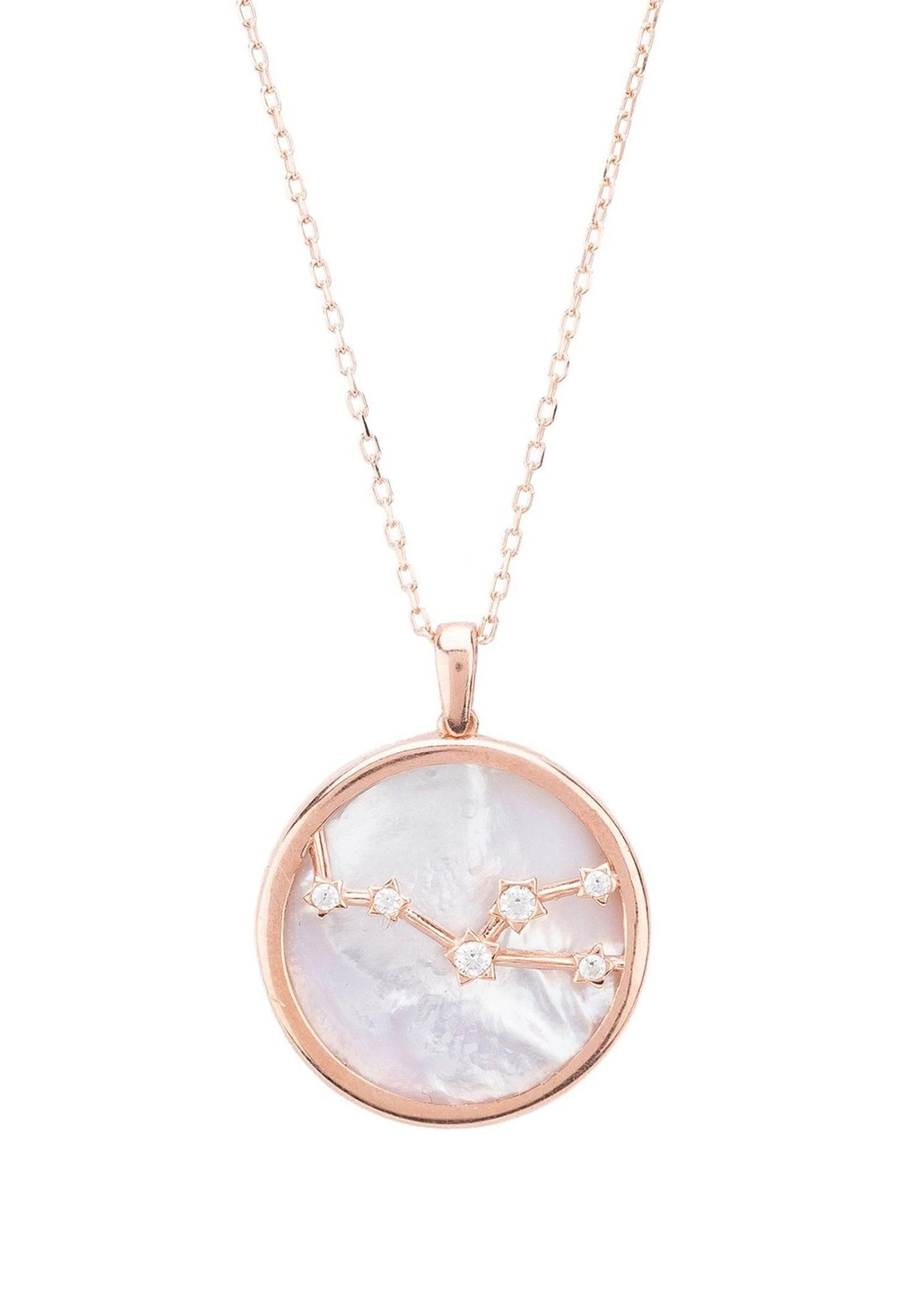 The natural beauty of white mother of pearl makes the perfect back drop to the sparkling star constellation in this zodiac pendant necklace. The reverse of this pendant is equally as beautiful, featuring cut-out stars with the soothing properties of mother of pearl gently peeping through and the engraved name of your star sign.
